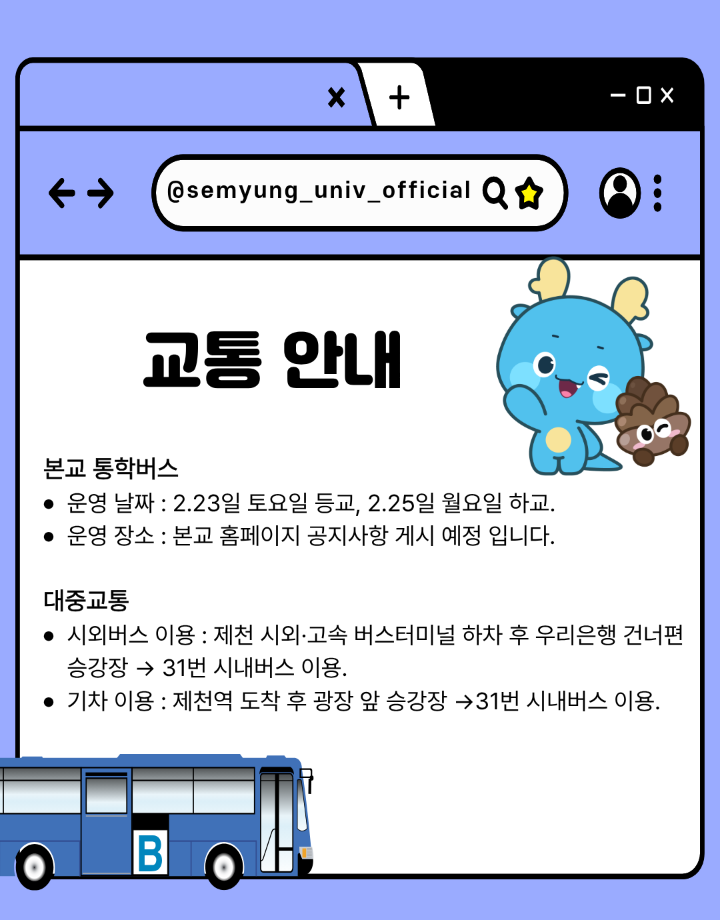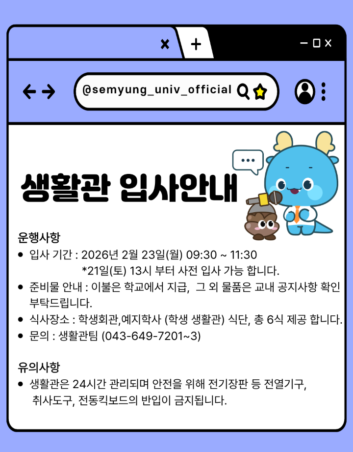 입시생을 위한 링크서비스 입학안내 수시모집 정시모집 편입학 Q&A 학과안내 성적자동산출 입시자료신청 대학소개 장학제도 >학생생활관(기숙사) >찾아오시는길 캠퍼스투어 >국제교류 >학군단(ROTC) >통학버스 입시생 레이어 닫기