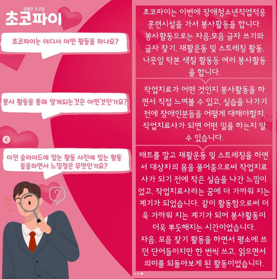 본문 시작 홈으로 커뮤니티 학과소개 진로 및 취업 학과과정 커뮤니티 SNS 홈페이지가이드 학과 소식 및 행사 학과공지 학과 소식 및 행사 대학생활 엿보기 어쩌다 출근 챌린지 학생회 동아리 통학버스 시간표 학과 소식 및 행사 페이스북 트위터 프린트 동아리 소개 [초코파이] 작업치료학과 4553 2022-10-26 목록 이전동아리 소개 [9988] 다음 2022 실습후기모음 (아동파트 대학병원, 종합병원) 담당부서 : 작업치료학과 담당자 : - 연락처 : 043-649-1632 최종수정일 : 2024-10-26 만족도조사 만족도 조사 이 페이지에서 제공하는 정보에 대하여 만족하시나요? 매우만족 만족 보통 불만족 매우불만족