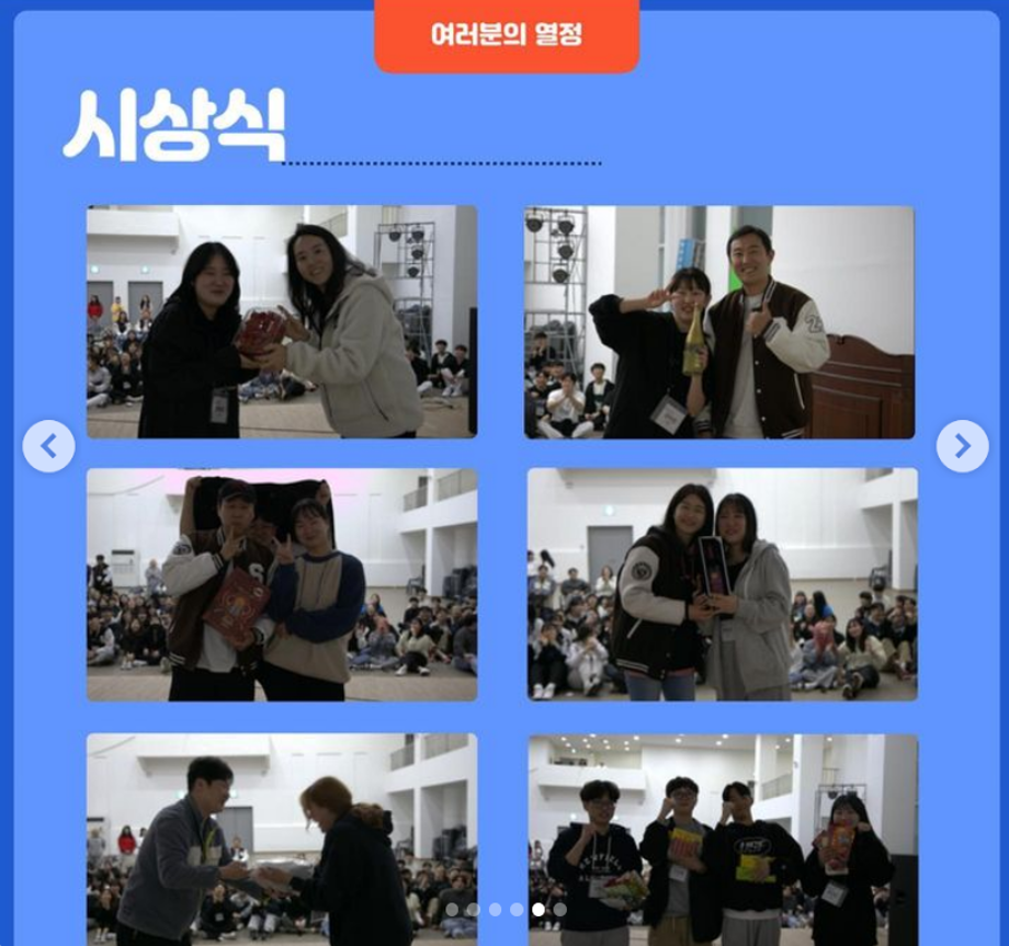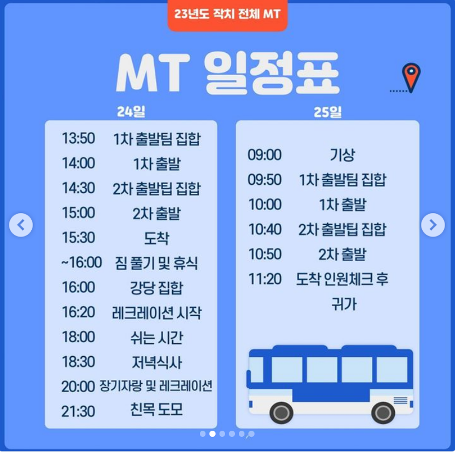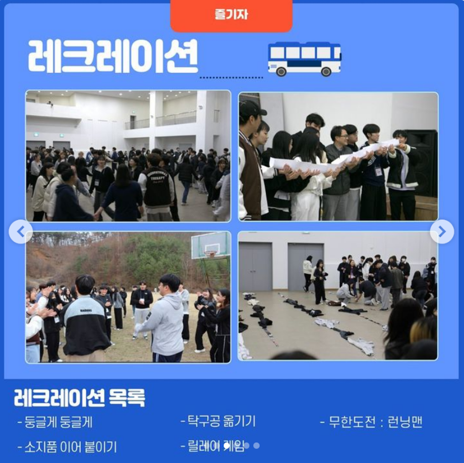 본문 시작 홈으로 커뮤니티 학과소개 진로 및 취업 학과과정 커뮤니티 SNS 홈페이지가이드 학과 소식 및 행사 학과공지 학과 소식 및 행사 대학생활 엿보기 어쩌다 출근 챌린지 학생회 동아리 통학버스 시간표 학과 소식 및 행사 페이스북 트위터 프린트 2023 년 학과 전체 엠티!! 작업치료학과 5026 2023-04-04 코로나 19로 인해 지난 3년간 진행되지 못했던 “작업치료학과 연합MT”가 진행되었습니다. 신입생들부터 재학생, 편입생, 복학생, 교수님들 모두가 다같이 즐거운 시간을 보내는 시간이었습니다. 장소: 제천 청소년 수련원 (충북 제천시 봉양읍 제원로 623) 일시: 3월 24일(금)-3월 25일(토) 참가인원: 작업치료학과 구성원 전원(신입생, 재학생, 복학생, 편입생, 교수진) 목록 이전세명 진로 Festival ~ 동영상 강좌 보면서 겨울을 알차게~! 다음 2023 년 학과 전체 엠티사진 담당부서 : 작업치료학과 담당자 : - 연락처 : 043-649-1632 최종수정일 : 2024-10-26 만족도조사 만족도 조사 이 페이지에서 제공하는 정보에 대하여 만족하시나요? 매우만족 만족 보통 불만족 매우불만족
