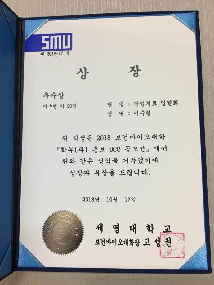본문 시작 홈으로 커뮤니티 학과소개 진로 및 취업 학과과정 커뮤니티 SNS 홈페이지가이드 학과 소식 및 행사 학과공지 학과 소식 및 행사 대학생활 엿보기 어쩌다 출근 챌린지 학생회 동아리 통학버스 시간표 학과 소식 및 행사 페이스북 트위터 프린트 작업치료학과 홍보 UCC 공모전 우수상 수상 작업치료학과 7195 2018-10-19 10월 17일, 보건바이오대학이 주최하는 학부(과) 홍보 UCC 공모전에서 저희 작업치료학과가 우수상을 받게 되었습니다.👍 홍보부장 이수현 학생이 대표로 상을 받았습니다.😊 임원진들이 함께 개사를 하여 녹음을 하였고, 서상민 교수님께서 특별 출연을 해주셨습니다.❤️ 좋은 UCC 작품이 나올 수 있게 한 임원진 모두 수고 많으셨습니다.💓 목록 이전작업치료학과 과소풍 다음 2018 1차 학술특강 실시 담당부서 : 작업치료학과 담당자 : - 연락처 : 043-649-1632 최종수정일 : 2024-10-26 만족도조사 만족도 조사 이 페이지에서 제공하는 정보에 대하여 만족하시나요? 매우만족 만족 보통 불만족 매우불만족