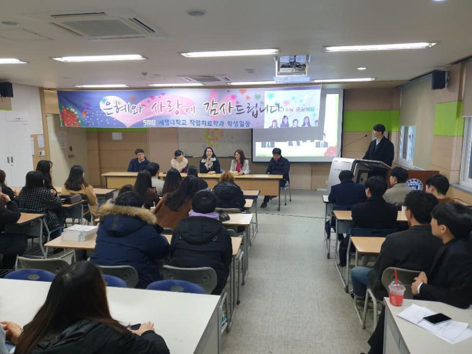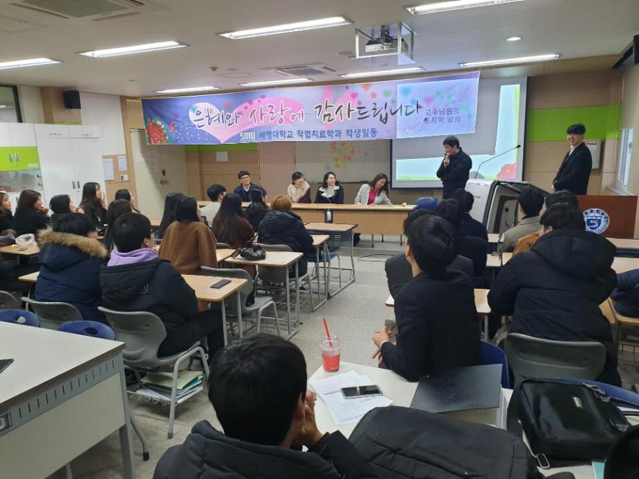 본문 시작 홈으로 커뮤니티 학과소개 진로 및 취업 학과과정 커뮤니티 SNS 홈페이지가이드 학과 소식 및 행사 학과공지 학과 소식 및 행사 대학생활 엿보기 어쩌다 출근 챌린지 학생회 동아리 통학버스 시간표 학과 소식 및 행사 페이스북 트위터 프린트 2018년도 사은회 작업치료학과 7096 2018-12-10 12월 10일, 작업치료사 국가시험을 보고 돌아온 4학년 학생들이 교수님들을 모시고 사은회를 진행하였습니다. 사은회는 과대표 학생의 편지 낭독, 그동안 교수님들께 궁금했던 질문들, 마지막으로 4학년 학생들에게 하고 싶은 교수님의 말씀 순으로 진행하였습니다. 4학년 학생들이 졸업하기 전 교수님들과 거리감 없이 함께 나눌 수 있는 좋은 시간이었습니다. 그동안 많은 가르침을 주신 스승의 은혜를 잊지 않겠습니다. 감사합니다. 목록 이전제46회 작업치료사 국가시험 다음 2018 임상실습 간담회 담당부서 : 작업치료학과 담당자 : - 연락처 : 043-649-1632 최종수정일 : 2024-10-26 만족도조사 만족도 조사 이 페이지에서 제공하는 정보에 대하여 만족하시나요? 매우만족 만족 보통 불만족 매우불만족
