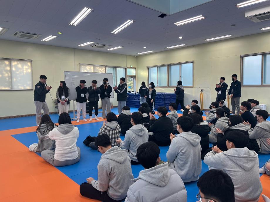 2일차에는 교수님 소개 및 책임지도교수 상담, 레크레이션을 통해 조별로 가까워지는 시간을 가지고 전공체험을 위해 유도장에서 순환식 체력시험인 PST를 진행하였고 체육관으로 이동해 신입생 장기자랑과 커뮤니티 공연을 관람하였습니다.