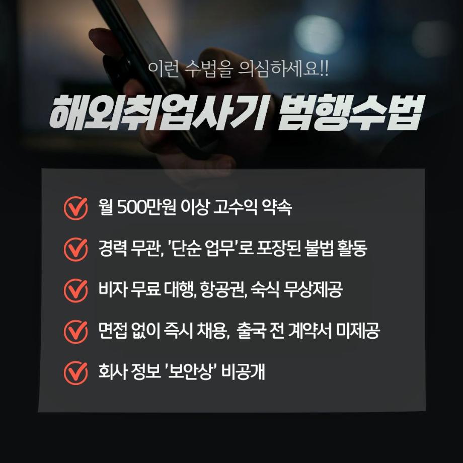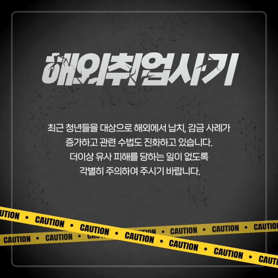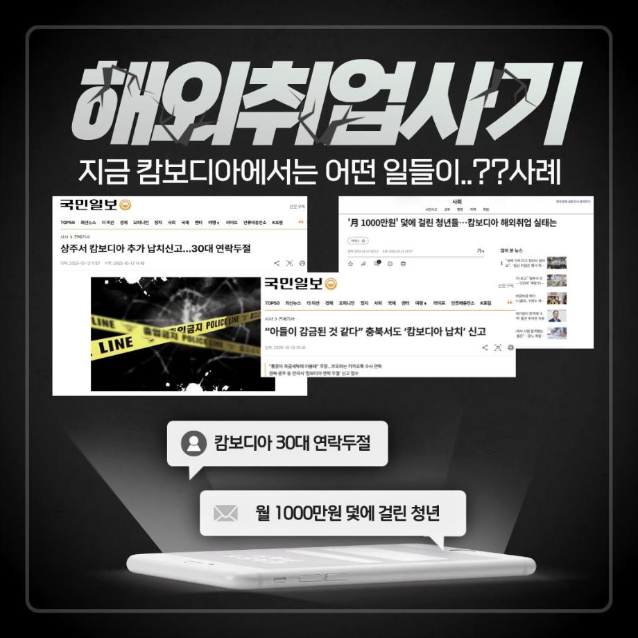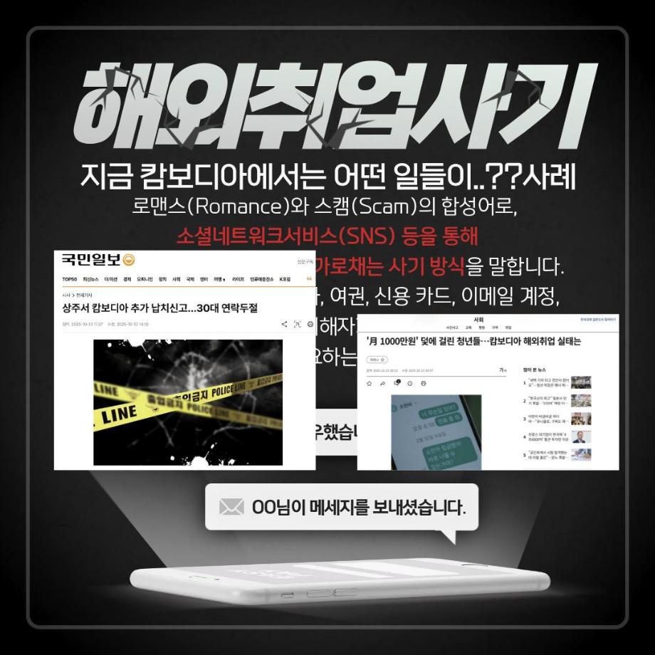 본문 시작 홈으로 커뮤니티 학과소개 교수소개 학과과정 커뮤니티 홈페이지가이드 포토갤러리 학부공지 학과일정 포토갤러리 학생회 동아리 포토갤러리 페이스북 트위터 프린트 해외 취업사기 범죄예방교육 경찰학과 1886 2025-10-20 안녕하세요 세명대학교 경찰학과 입니다. 최근 이슈가 되고있는 해외취업사기 관련카드뉴스 입니다. 목록 이전상담받고GO! 쿠폰받GO! 무료로 대학 지원하GO! 다음 [제천제일고등학교] 진로체험 프로그램 만족도조사 만족도 조사 이 페이지에서 제공하는 정보에 대하여 만족하시나요? 매우만족 만족 보통 불만족 매우불만족