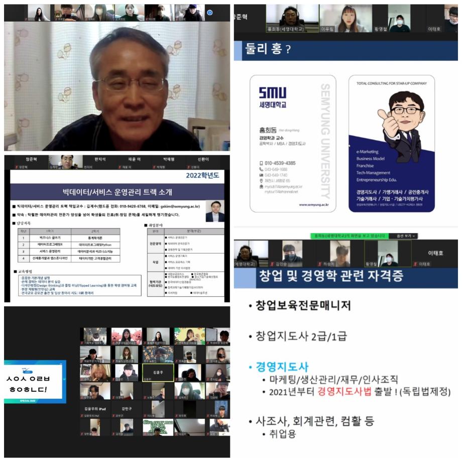 본문 시작 홈으로 커뮤니티 학과소개 학생진로 교과과정 커뮤니티 학과 SNS 홈페이지가이드 학과 갤러리 공지사항 대학원 학과 갤러리 학과 이야기 동아리 학생회 학과 갤러리 페이스북 트위터 프린트 2022 신입생 온라인 꿈설계학기 경영학과 2503 2022-02-28 2022 신입생 온라인 오티인 꿈설계가 23일 열렸습니다. 김훈, 김계수, 곽지영, 홍희동, 함상우, 우태우, 최건동 교수님과 함께 학생회가 준비한 온라인 행사!! 장윤주 컨설턴트님의 특강, 학생회 주관 경영퀴즈, 트랙별 소개등 다양한 프로그램으로 신입생들이 서로 친해지고 정보를 얻는 즐겁고 유익한 시간이었습니다 목록 이전2022 신년 학과 워크샵 다음 2022 신입생 새내기 배움터 담당부서 : 경영학과 담당자 : - 연락처 : 043-649-1766 최종수정일 : 2024-10-26 만족도조사 만족도 조사 이 페이지에서 제공하는 정보에 대하여 만족하시나요? 매우만족 만족 보통 불만족 매우불만족