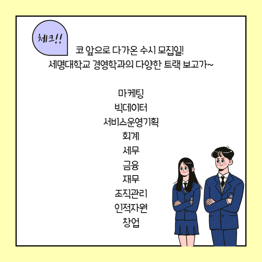 본문 시작 홈으로 커뮤니티 학과소개 학생진로 교과과정 커뮤니티 학과 SNS 홈페이지가이드 학과 갤러리 공지사항 대학원 학과 갤러리 학과 이야기 동아리 학생회 학과 갤러리 페이스북 트위터 프린트 2023학년도 경영학과 수시모집!! 경영학과 3298 2022-09-13 안녕하세요, 세명대학교 경영학과 홍보단 ‘은가비’입니다😎 2023학년도 수시 모집 기간이 하루 앞으로 다가왔습니다!! 다양한 트랙에서 실무형 인재 & 스마트 리더를 양성하는 세명대학교 경영학과!! 많은 관심과 지원 부탁드리며, 여러분을 응원하겠습니다. 우리 내년에 캠퍼스에서 만나요~💙 목록 이전경영학과 장학금 수여식 (feat. 최건동 교수님) 다음 제 6회 사회과학대학 토론대회 개최 담당부서 : 경영학과 담당자 : - 연락처 : 043-649-1766 최종수정일 : 2024-10-26 만족도조사 만족도 조사 이 페이지에서 제공하는 정보에 대하여 만족하시나요? 매우만족 만족 보통 불만족 매우불만족