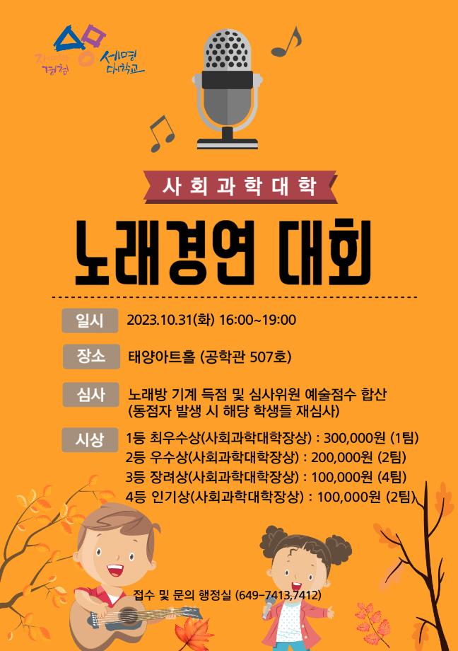 본문 시작 홈으로 커뮤니티 학과소개 학생진로 교과과정 커뮤니티 학과 SNS 홈페이지가이드 학과 갤러리 공지사항 대학원 학과 갤러리 학과 이야기 동아리 학생회 학과 갤러리 페이스북 트위터 프린트 [경영학과] 사회과학대학 노래경연대회 수상 경영학과 3317 2023-11-16 안녕하세요, 세명대학교 경영학과입니다! 10월 31일 화요일에 진행되었던 사회과학대학 노래경연대회에서 20학번 문정현 학생은 최우수상을, 21학번 신인애 학생은 장려상을 수상하였습니다! 멋진 무대와 감미로운 노래 실력 보여준 두 학생에게 큰 박수 부탁드립니다ㅎㅎ 목록 이전[경영학과] 대학원 논문 발표 다음 [경영학과] 한국생산관리학회 우수발표 논문상 수상 담당부서 : 경영학과 담당자 : - 연락처 : 043-649-1766 최종수정일 : 2024-10-26 만족도조사 만족도 조사 이 페이지에서 제공하는 정보에 대하여 만족하시나요? 매우만족 만족 보통 불만족 매우불만족