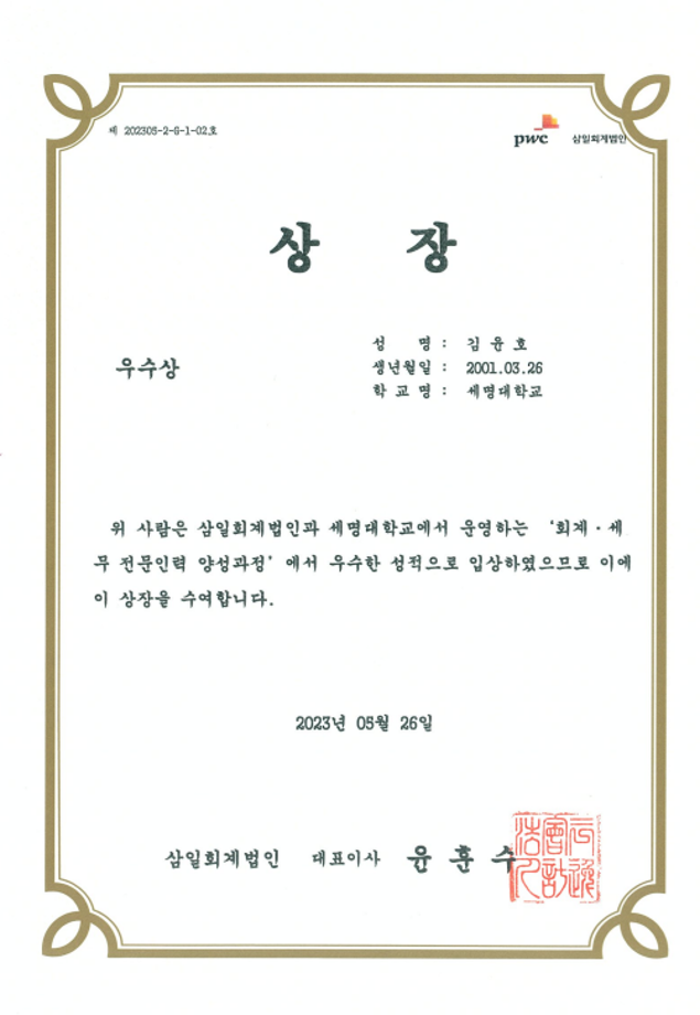 본문 시작 홈으로 커뮤니티 학과소개 학생진로 교과과정 커뮤니티 학과 SNS 홈페이지가이드 학과 갤러리 공지사항 대학원 학과 갤러리 학과 이야기 동아리 학생회 학과 갤러리 페이스북 트위터 프린트 [경영학과] 김서희, 김윤호 학생 삼일회계법인 대표이사상 수상 경영학과 2598 2024-02-28 삼일회계법인과 세명대학교에서 운영하는 삼일회계법인 주문식교육프로그램인 “회계세무전문인력 양성과정”의 회계관리 2급 자격증 분야에서 최우수상-23학번 김서희 학생 / 우수상-20학번 김윤호 학생이 우수한 성적으로 입상하여 상장을 수여하였다. 목록 이전[경영학과] 경영디너쇼 다음 [경영학과] 2024학년도 신입생 환영 영상 담당부서 : 경영학과 담당자 : - 연락처 : 043-649-1766 최종수정일 : 2024-10-26 만족도조사 만족도 조사 이 페이지에서 제공하는 정보에 대하여 만족하시나요? 매우만족 만족 보통 불만족 매우불만족