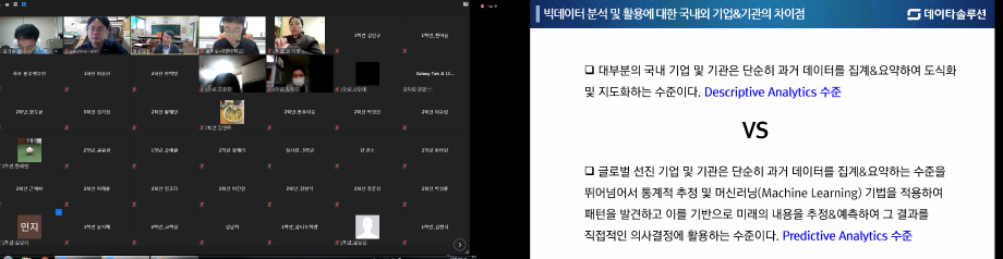 본문 시작 홈으로 커뮤니티 학과소개 학생진로 교과과정 커뮤니티 학과 SNS 홈페이지가이드 학과 갤러리 공지사항 대학원 학과 갤러리 학과 이야기 동아리 학생회 학과 갤러리 페이스북 트위터 프린트 경영학과 학술특강: 빅데이터와 예측분석. 무엇을 예측하고 어떻게 활용할 것인가? 경영학과 4408 2021-05-20 5월 20일 (목요일) 오전 10:30. 경영학과 학술 특강으로 데이터솔루션 정성원 상무님꼐서 빅데이터와 예측분석. 무엇을 예측하고 어떻게 활용할 것인가? 에 대해 특강을 해주셨습니다. 54명의 교수, 학생들이 참여하여 온라인(zoom)에서 안전하게 진행되었습니다. 4차 산업시대 빅데이터 활용을 위해 학생들에게 필요한 실무적 지식과 역량을 알아보는 뜻깊은 시간이었습니다. 목록 이전신입생 환영회 및 경영학과 행사 다음 2021 고교특강 (제천제일고) 담당부서 : 경영학과 담당자 : - 연락처 : 043-649-1766 최종수정일 : 2024-10-26 만족도조사 만족도 조사 이 페이지에서 제공하는 정보에 대하여 만족하시나요? 매우만족 만족 보통 불만족 매우불만족