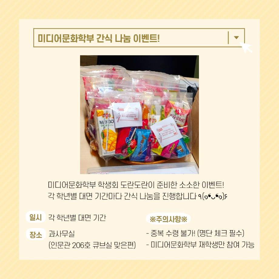 본문 시작 홈으로 커뮤니티 학부소개 교육과정 학부소식 커뮤니티 홈페이지가이드 학생회 학생회 동아리 자료실 장비대여 자유게시판 학생회 페이스북 트위터 프린트 [학생회 활동] 2021학년도 1학기 간식나눔 행사 학생회 2949 2021-06-17 각 학년 대면기간을 맞이하여 격려와 응원의 의미로 간식을 나누어 주는 행사를 진행했습니다. 목록 이전[학생회 활동] 2021학년도 1학기 신입생 환영회 행사 다음 [학생회 활동] 제 29대 학생회 단체 사진-1학기 담당부서 : 미디어문화학부 담당자 : - 연락처 : 043-649-1760 최종수정일 : 2024-10-26 만족도조사 만족도 조사 이 페이지에서 제공하는 정보에 대하여 만족하시나요? 매우만족 만족 보통 불만족 매우불만족