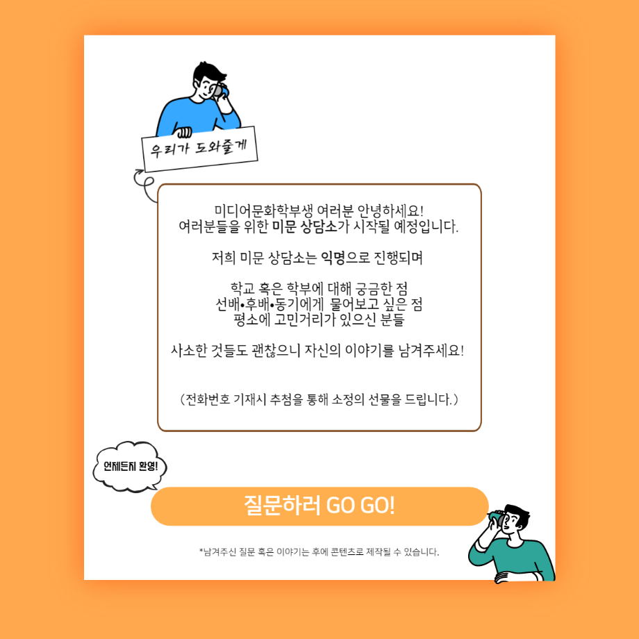 본문 시작 홈으로 커뮤니티 학부소개 교육과정 학부소식 커뮤니티 홈페이지가이드 학생회 학생회 동아리 자료실 장비대여 자유게시판 학생회 페이스북 트위터 프린트 [학생회 활동] 미문상담소 학생회 3261 2022-04-30 미디어문화학부생 여러분 안녕하세요! 미문 상담소에 대해 안내드립니다😊 학부에 대해 궁금한 점, 선배•후배•동기에게 물어보고 싶은 점, 자신의 고민 등 사소한 것들도 괜찮으니 자신의 이야기를 남겨주세요! 익명으로 진행되므로 편하게 작성해주세요 :) *남겨주신 질문 혹은 이야기는 후에 콘텐츠로 제작될 수 있습니다! (전화번호를 남겨주실 경우, 추첨을 통해 소정의 선물을 드릴 예정입니다.) https://naver.me/5okYea3H 목록 이전[학생회 활동] 2021-2 응원 간식 포장 다음 [학생회 활동] 2022년 1학기 선.사.친 활동 중간보고 담당부서 : 미디어문화학부 담당자 : - 연락처 : 043-649-1760 최종수정일 : 2024-10-26 만족도조사 만족도 조사 이 페이지에서 제공하는 정보에 대하여 만족하시나요? 매우만족 만족 보통 불만족 매우불만족