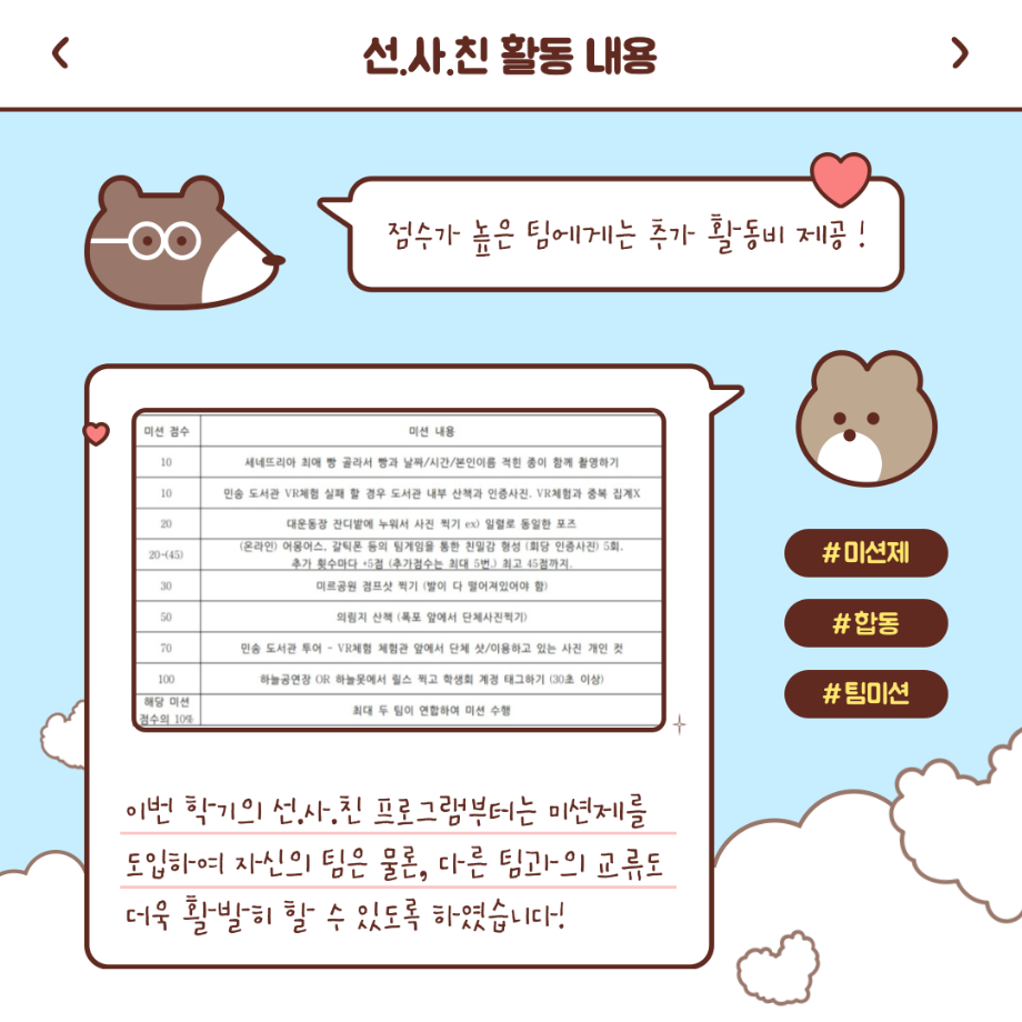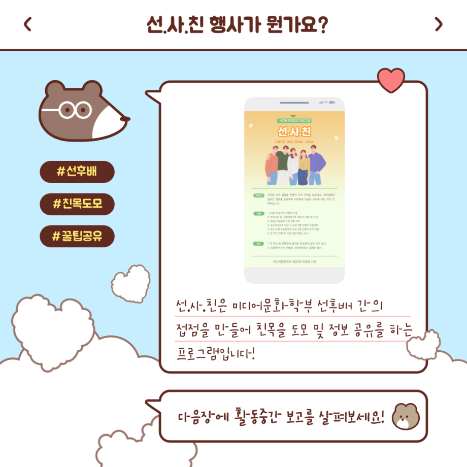 본문 시작 홈으로 커뮤니티 학부소개 교육과정 학부소식 커뮤니티 홈페이지가이드 학생회 학생회 동아리 자료실 장비대여 자유게시판 학생회 페이스북 트위터 프린트 [학생회 활동] 2022년 1학기 선.사.친 활동 중간보고 학생회 3276 2022-04-30 이번 학기 선.사.친 활동부터는 미션제를 도입하여 더욱 활발하게 활동할 수 있도록 하였습니다! 자세한 활동 사진은 학부 인스타그램에서 확인 부탁드립니다 :) 목록 이전[학생회 활동] 미문상담소 다음 [학생회 활동] 지구방위대 챌린지 촬영 보고 담당부서 : 미디어문화학부 담당자 : - 연락처 : 043-649-1760 최종수정일 : 2024-10-26 만족도조사 만족도 조사 이 페이지에서 제공하는 정보에 대하여 만족하시나요? 매우만족 만족 보통 불만족 매우불만족
