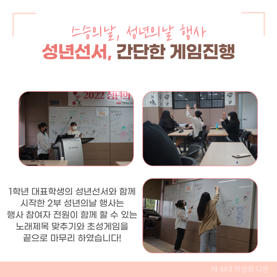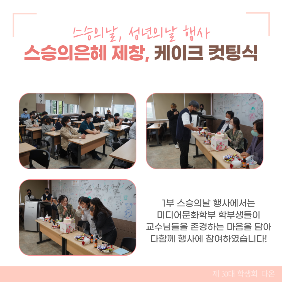 본문 시작 홈으로 커뮤니티 학부소개 교육과정 학부소식 커뮤니티 홈페이지가이드 학생회 학생회 동아리 자료실 장비대여 자유게시판 학생회 페이스북 트위터 프린트 [학생회 활동] 스승의날, 성년의날 행사 되돌아보기 학생회 3301 2022-05-20 지난 5월13일에 미디어문화학부 스승의날과 성년의날 행사가 있었습니다! 행사 진행과정을 한번 살펴볼까요? 1부 스승의날 행사에서는 미디어문화학부 학부생들이 교수님들을 존경하는 마음을 담아 다함께 행사에 참여하였습니다! 1학년 대표학생의 성년선서와 함께 시작한 2부 성년의날 행사는 행사 참여자 전원이 함께 할 수 있는노래제목 맞추기와 초성게임을 끝으로 마무리 하였습니다! 목록 이전미디어문화학부 전공 체험 - 제천제일고 다음 🏆미디어문화학부 학생회, 2022 E-sports 대회 : 인문예술리그 개최🏆 담당부서 : 미디어문화학부 담당자 : - 연락처 : 043-649-1760 최종수정일 : 2024-10-26 만족도조사 만족도 조사 이 페이지에서 제공하는 정보에 대하여 만족하시나요? 매우만족 만족 보통 불만족 매우불만족