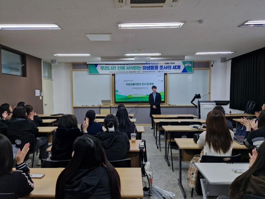 본문 시작 홈으로 학과게시판 학과소개 교육과정 학과게시판 관련사이트 홈페이지가이드 포토갤러리 학과소식 포토갤러리 동아리 소개 포토갤러리 페이스북 트위터 프린트 진로페스티벌 "야생동물 조사의 세계" 동물보건학과 1843 2024-04-22 2024년 1학기 진로페스티벌 프로그램으로 소백산 국립공원 북부사무소 (단양소재)에 근무하시는 최영준 계장님을 초청하였습니다. 소백산 국립공원에서 진행중인 소백산 서식 생물자원 조사와 관련된 재미있는 이야기를 들었습니다. 동물원만 생각했던 야생동물의 세계가 우리 주변의 산으로 확대 되었습니다. 목록 이전동물원에 다녀왔습니다!!!! 다음 아모니멀 수제간식 나눔행사 담당부서 : 동물보건학과 담당자 : - 연락처 : 043-649-1627 최종수정일 : 2024-10-26 만족도조사 만족도 조사 이 페이지에서 제공하는 정보에 대하여 만족하시나요? 매우만족 만족 보통 불만족 매우불만족