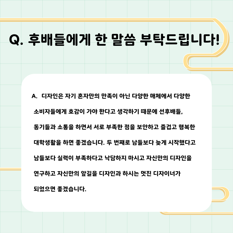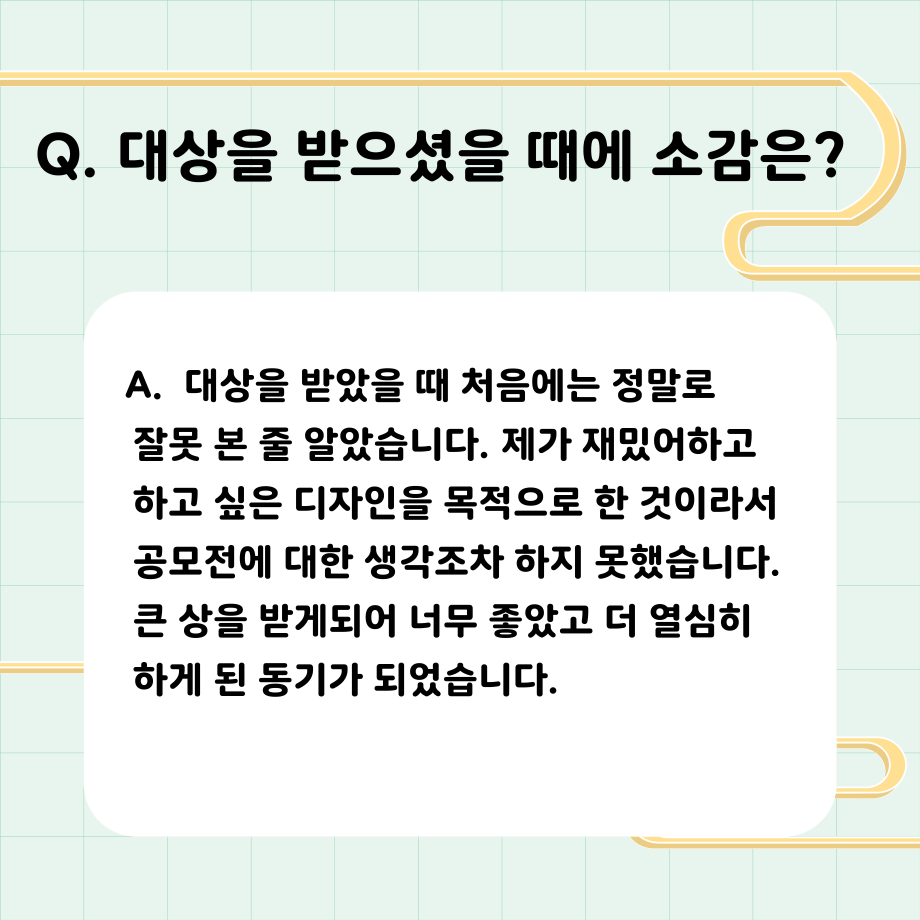 본문 시작 홈으로 학과자랑 학과소개 학과과정 시영소식 입학/취업 AI 학과자랑 SNS소통 홈페이지가이드 갤러리 학과자랑 갤러리 공모전 동아리 졸업전시회 갤러리 페이스북 트위터 프린트 공모전 대상 입상자 인터뷰! - 이성복 학생 시각영상디자인학과 3114 2023-06-05 목록 이전2023년도 시각영상디자인학과 재학생에게 직접 물었습니다! [수업 소감이 어떠신가요?] 다음 공모전 최우수상 입상자 인터뷰 - 김한별 학생 담당부서 : 시각영상디자인학과 담당자 : - 연락처 : 043-649-1726 최종수정일 : 2024-10-26 만족도조사 만족도 조사 이 페이지에서 제공하는 정보에 대하여 만족하시나요? 매우만족 만족 보통 불만족 매우불만족