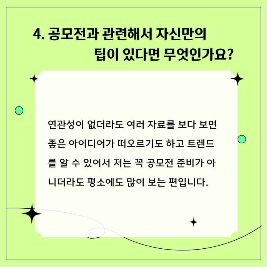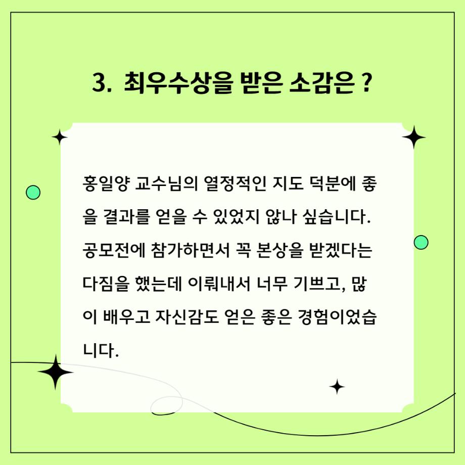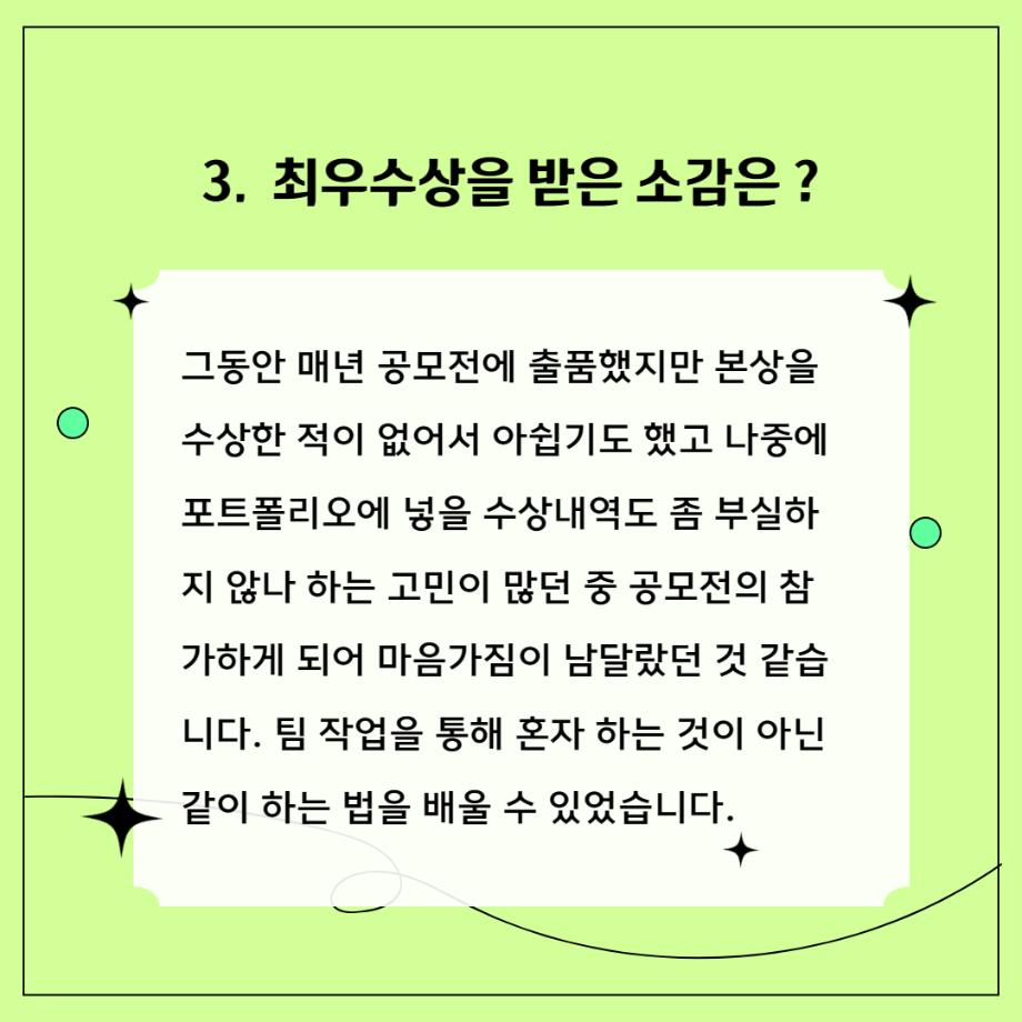본문 시작 홈으로 학과자랑 학과소개 학과과정 시영소식 입학/취업 AI 학과자랑 SNS소통 홈페이지가이드 갤러리 학과자랑 갤러리 공모전 동아리 졸업전시회 갤러리 페이스북 트위터 프린트 공모전 최우수상 입상자 인터뷰 - 김한별 학생 시각영상디자인학과 3203 2023-06-12 목록 이전공모전 대상 입상자 인터뷰! - 이성복 학생 다음 벽화활동 인터뷰 - 박범준 학생 담당부서 : 시각영상디자인학과 담당자 : - 연락처 : 043-649-1726 최종수정일 : 2024-10-26 만족도조사 만족도 조사 이 페이지에서 제공하는 정보에 대하여 만족하시나요? 매우만족 만족 보통 불만족 매우불만족