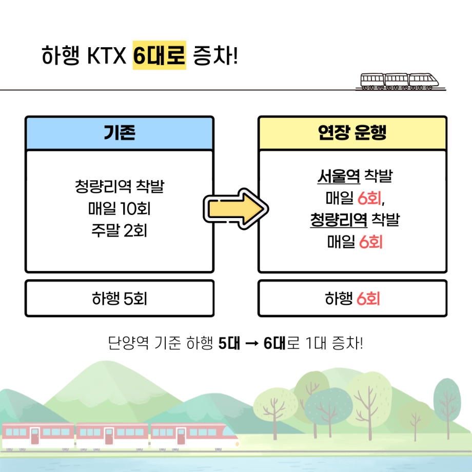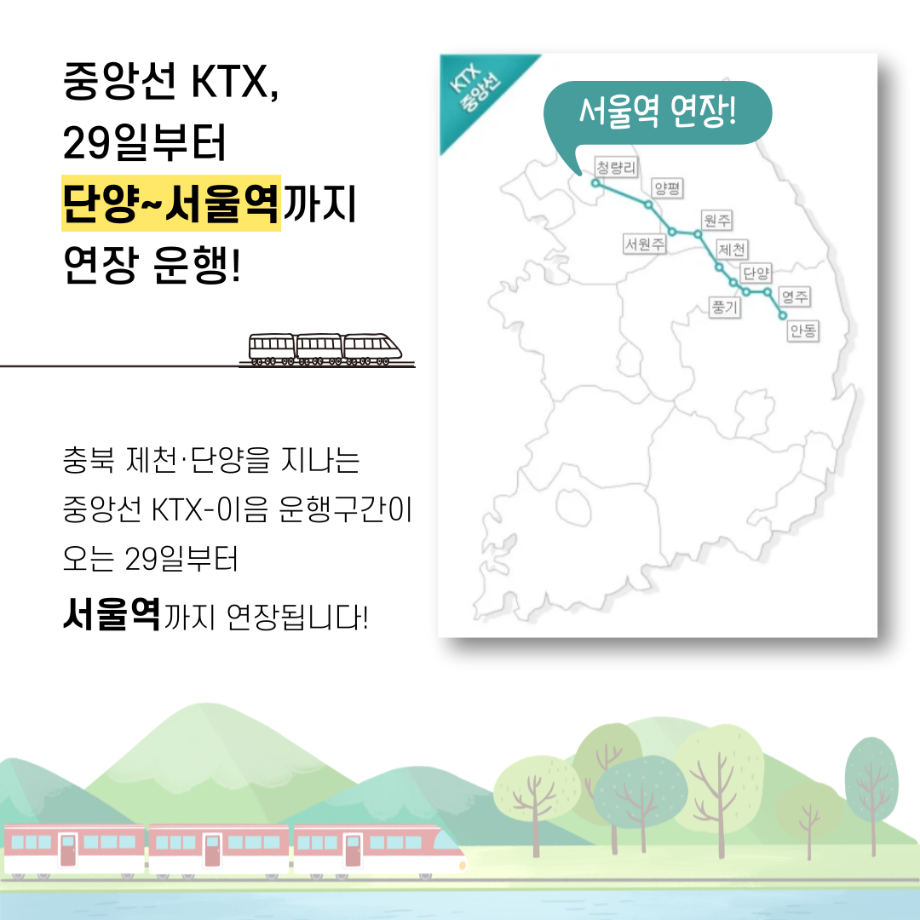 본문 시작 홈으로 학과자랑 학과소개 학과과정 시영소식 입학/취업 AI 학과자랑 SNS소통 홈페이지가이드 갤러리 학과자랑 갤러리 공모전 동아리 졸업전시회 갤러리 페이스북 트위터 프린트 KTX중앙선 연장 안내 시각영상디자인학과 2218 2023-12-28 12/29 부터 제천, 단양을 지나는 중앙선 KTX가 서울역까지 연장됩니다! 열차 또한 증차되고, 단양↔서울간 소요 시간도 단축되면서 세명대↔서울간 소요 시간도 단축됩니다 편리한 통학과 함께 더욱 가까워진, 재미있는 경험 가득한 세명대학교로 오세요! 목록 이전제32회 대전디자인어워드 특별상 다음 2023년 시각영상디자인학과 공모전 수상 실적 담당부서 : 시각영상디자인학과 담당자 : - 연락처 : 043-649-1726 최종수정일 : 2024-10-26 만족도조사 만족도 조사 이 페이지에서 제공하는 정보에 대하여 만족하시나요? 매우만족 만족 보통 불만족 매우불만족