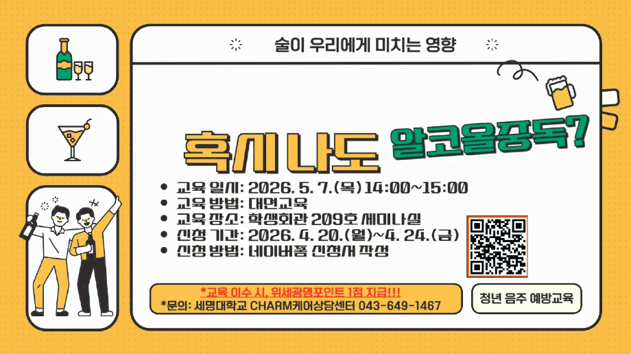본문 시작 홈으로 학과생활 학과소개 교수소개 교과과정 학과생활 홈페이지가이드 사진게시판 공지사항 사진게시판 전공자료실 동아리 학과행사 사진게시판 페이스북 트위터 프린트 [CHARM케어상담센터 ] 2026학년도 1학기 알코올중독 예방교육 실시 아트앤산업디자인학과 30 2026-04-20 목록 이전[취창업처] [2026대일플] 졸업(예정)자 대상 고용노동부 [국민취업지원제도] 사업 안내 담당부서 : 산업디자인학과 담당자 : - 연락처 : 043-649-1436 최종수정일 : 2024-10-26 만족도조사 만족도 조사 이 페이지에서 제공하는 정보에 대하여 만족하시나요? 매우만족 만족 보통 불만족 매우불만족