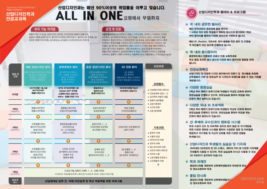 본문 시작 홈으로 학과생활 학과소개 교수소개 교과과정 학과생활 홈페이지가이드 사진게시판 공지사항 사진게시판 전공자료실 동아리 학과행사 사진게시판 페이스북 트위터 프린트 [브로셔] 2023년 산업디자인학과 소개 책자 산업디자인학과 3134 2023-09-12 목록 이전세명대 산업디자인학과를 졸업하고 무엇을 할 수 있나요?-공공/환경 디자이너 편! 다음 [졸업전시회] 2023학년도 4학년 졸업전시회 포스터 담당부서 : 산업디자인학과 담당자 : - 연락처 : 043-649-1436 최종수정일 : 2024-10-26 만족도조사 만족도 조사 이 페이지에서 제공하는 정보에 대하여 만족하시나요? 매우만족 만족 보통 불만족 매우불만족