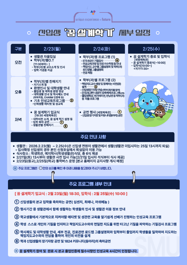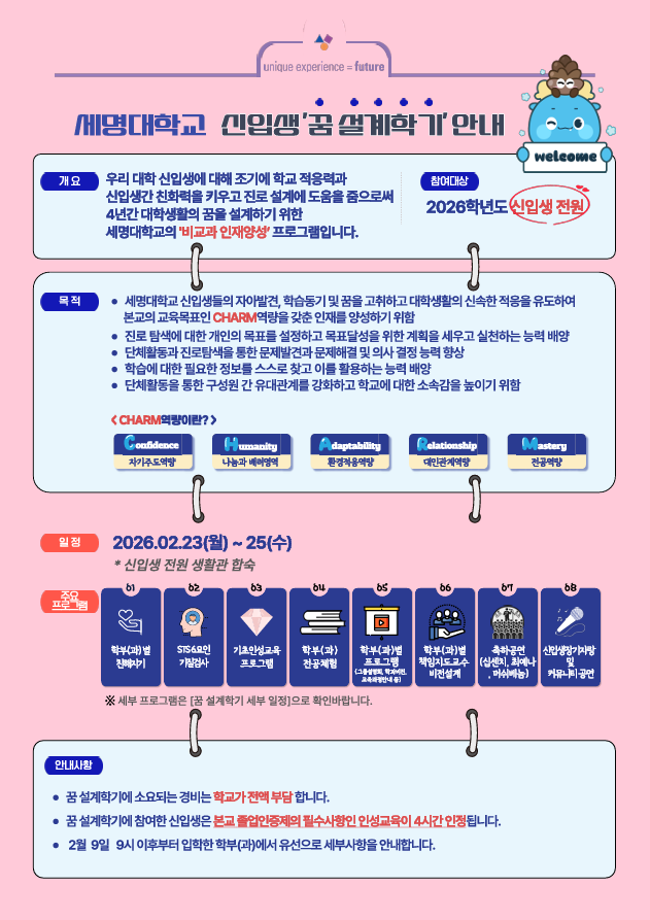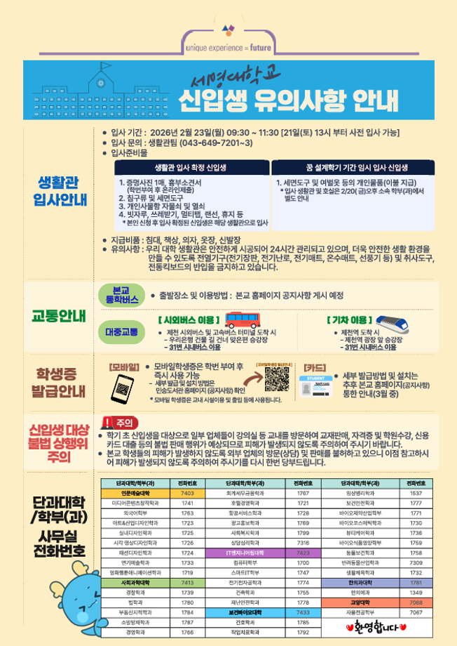 본문 시작 홈으로 학과생활 학과소개 교수소개 교과과정 학과생활 홈페이지가이드 사진게시판 공지사항 사진게시판 전공자료실 동아리 학과행사 사진게시판 페이스북 트위터 프린트 [학생처] 2026학년도 신입생 '꿈 설계학기(오리엔테이션)' 시행 산업디자인학과 447 2026-02-04 목록 이전다이소 세명대점 오픈(2/19) 안내 다음 [학생처] 2026학년도 신입생 '꿈 설계학기' 기간 중 통학버스 운행 안내 담당부서 : 산업디자인학과 담당자 : - 연락처 : 043-649-1436 최종수정일 : 2024-10-26 만족도조사 만족도 조사 이 페이지에서 제공하는 정보에 대하여 만족하시나요? 매우만족 만족 보통 불만족 매우불만족