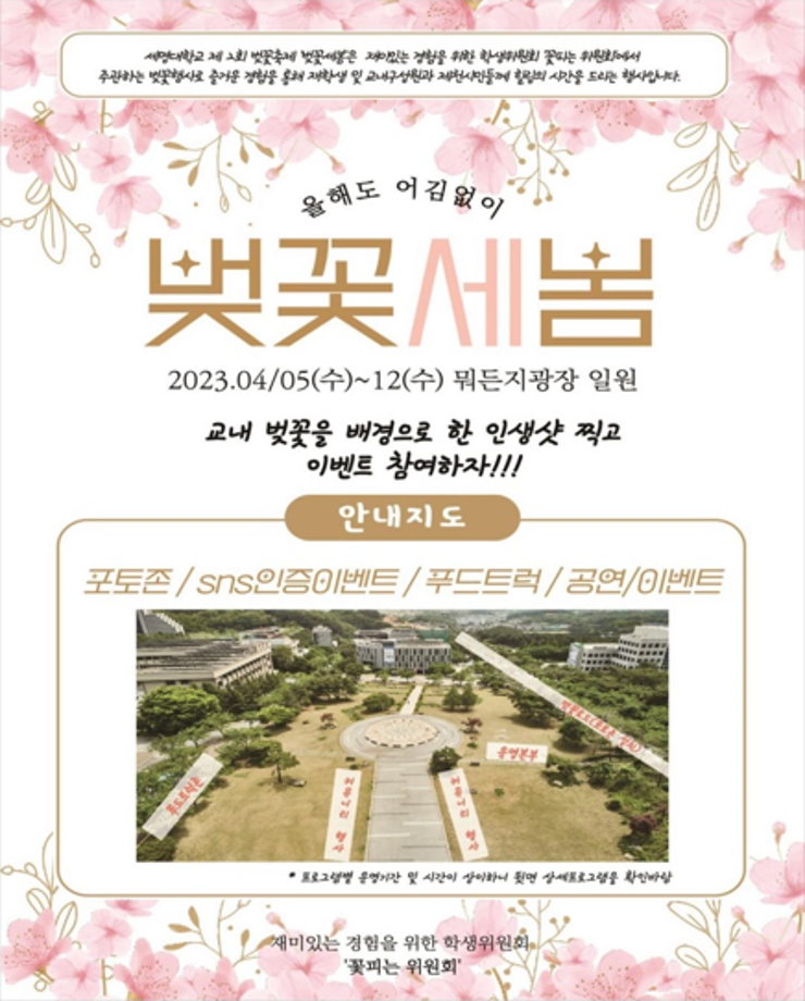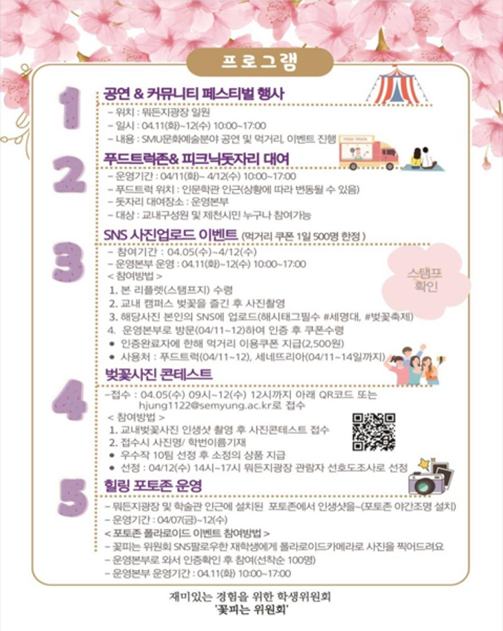 본문 시작 홈으로 커뮤니티 학과소개 교수소개 학과과정 커뮤니티 대학원 홈페이지가이드 포토갤러리 공지사항 채용정보 포토갤러리 Youtube 바로가기 Instargram 바로가기 Blog 바로가기 Facebook 바로가기 포토갤러리 페이스북 트위터 프린트 🌸 벚꽃세봄 🌸 뷰티케어학 2502 2023-04-04 일정 : 2023.04.05 (수) ~ 2023.04.12 (수) 장소 : 뭐든지 광장 일원 🌸 세명대학교가 제2회 벚꽃축제 “벚꽃세봄”은 재미있는 경험을 위한 학생위원회 ‘꽃피는 위원회’에서 주관하는 벚꽃 행사입니다! 재학생 및 교내 구성원과 제천시민 분들께 힐링을 드립니다 :) 🌸 벚꽃 사진 콘테스트, 포토존, 돗자리 대여, 즐거운 공연까지! 다양한 행사와 즐거움이 가득한 행사를 즐겨보세요😆 목록 다음 세명대학교 등록금 환불제 다음 🎊세명대학교 제 30회 청룡축전🎊