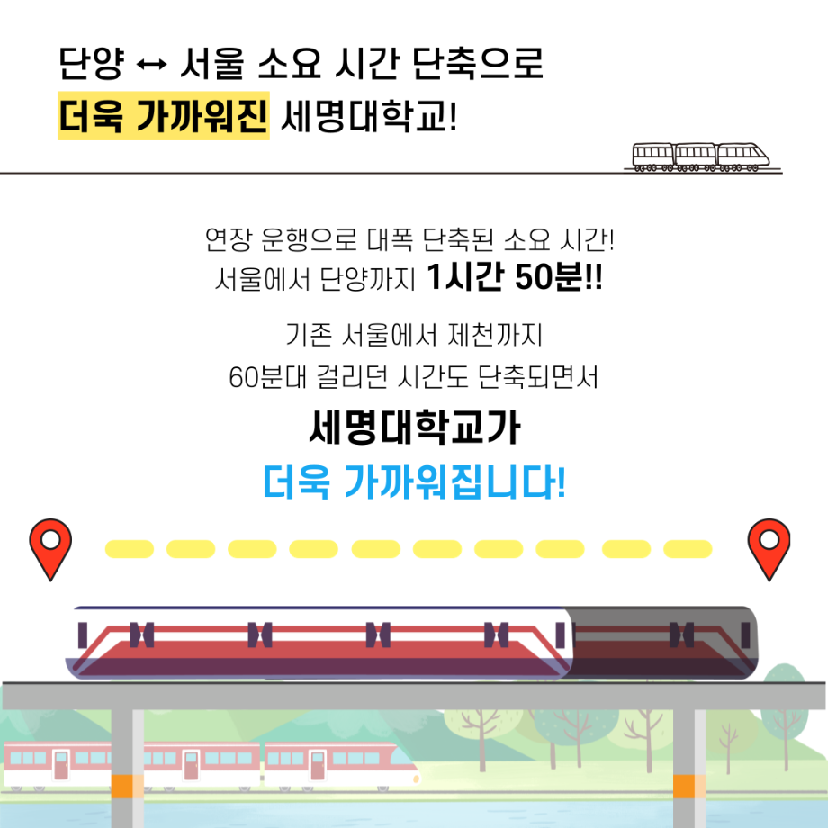본문 시작 홈으로 커뮤니티 학과소개 교수소개 학과과정 커뮤니티 대학원 홈페이지가이드 포토갤러리 공지사항 채용정보 포토갤러리 Youtube 바로가기 Instargram 바로가기 Blog 바로가기 Facebook 바로가기 포토갤러리 페이스북 트위터 프린트 더 가까워진 세명대학교! 뷰티케어학 2254 2023-12-26 🚅 더 가까워진 세명대학교! 29일부터 제천, 단양을 지나는 중앙선 KTX가 ✨서울역까지 연장✨된다는 사실!!👀 열차 또한 증차되고, 단양↔서울간 소요 시간도 단축되면서 세명대↔서울간 소요 시간도 단축됩니다👍👍 편리한 통학과 함께 더욱 가까워진! 재미있는 경험 가득한 💙세명대학교💙로 오세요~~! 목록 이전세명대학교 2024학년도 정시모집 안내 이전📢 2024학년도 세명대학교 수시모집 충원합격자 발표 및 등록 안내