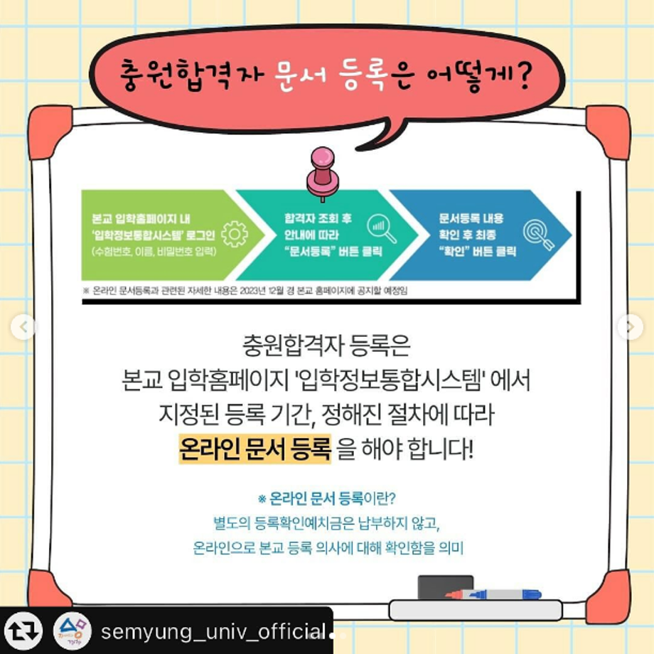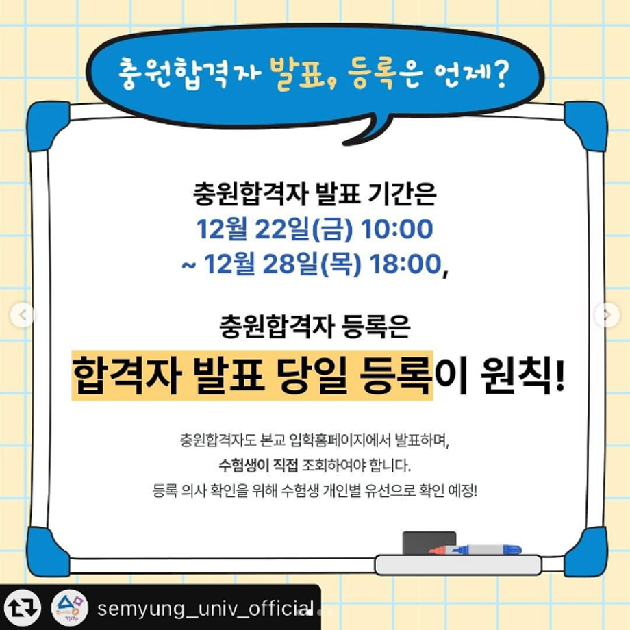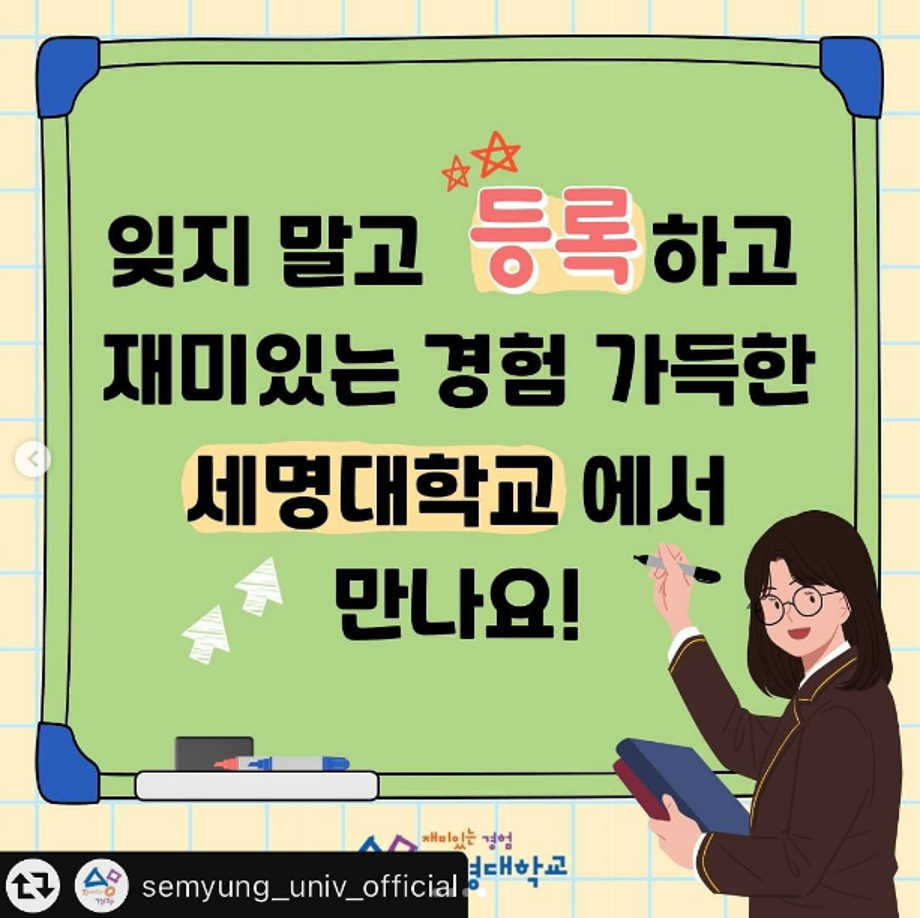 본문 시작 홈으로 커뮤니티 학과소개 교수소개 학과과정 커뮤니티 대학원 홈페이지가이드 포토갤러리 공지사항 채용정보 포토갤러리 Youtube 바로가기 Instargram 바로가기 Blog 바로가기 Facebook 바로가기 포토갤러리 페이스북 트위터 프린트 📢 2024학년도 세명대학교 수시모집 충원합격자 발표 및 등록 안내 뷰티케어학 2717 2023-12-22 2024학년도 수시모집 충원합격자 발표 및 등록 안내입니다👍 ✔12월 22일(금) 10:00부터 28일(금) 18:00✔까지 충원합격자 발표! 충원합격자 등록은 👉합격자 발표 당일 등록!!👈 잊지 말고 등록하고 ✨재미있는 경험 가득한 💙세명대학교💙에서 만나요! 목록 다음 더 가까워진 세명대학교! 다음 세명대학교도 지구를 위해 함께합니다!