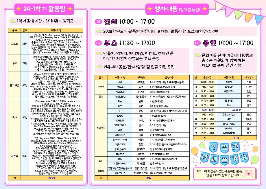 본문 시작 홈으로 커뮤니티 학과소개 교수소개 학과과정 커뮤니티 대학원 홈페이지가이드 포토갤러리 공지사항 채용정보 포토갤러리 Youtube 바로가기 Instargram 바로가기 Blog 바로가기 Facebook 바로가기 포토갤러리 페이스북 트위터 프린트 커뮤니티 페스티벌✨ 뷰티케어학 1848 2024-04-01 커뮤니티 페스티벌 4월 2~3일 봄을 맞아 새로운 행사가 열립니다! 여러 부스 활동들과 먹거리, 공연등이 펼쳐지니 많은 관심과 참여 부탁드립니다:) 전시,부스 종류와 공연시간등을 잘 참고하셔서 즐기시길 바래요✨ 전시-10:00~17:00 부스-11:30~17:00 공연-14:00~16:00 📍뭐든지 광장 (위치는 지도 참고) 목록 이전💫모듈형 교육과정 뷰티영양학 토론수업💫 다음 벚꽃세봄✨
