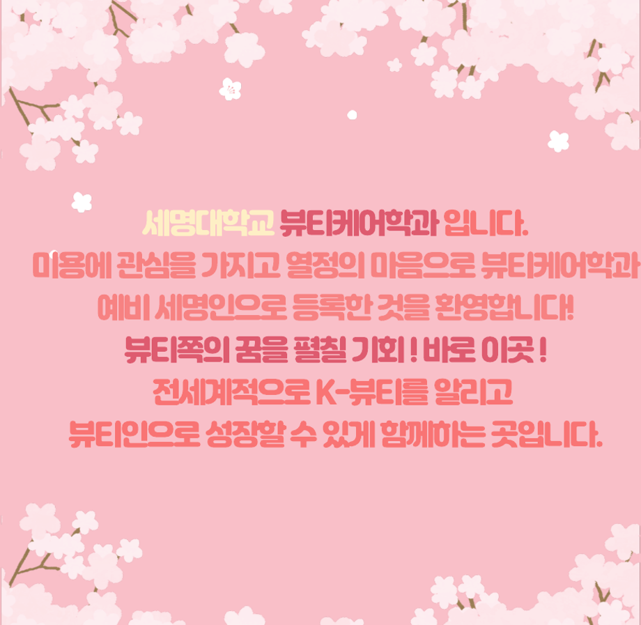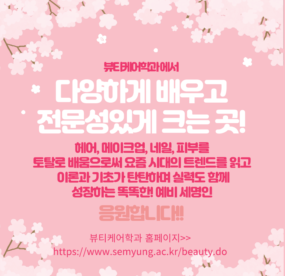 본문 시작 홈으로 커뮤니티 학과소개 교수소개 학과과정 커뮤니티 대학원 홈페이지가이드 포토갤러리 공지사항 채용정보 포토갤러리 Youtube 바로가기 Instargram 바로가기 Blog 바로가기 Facebook 바로가기 포토갤러리 페이스북 트위터 프린트 예비smu뷰티케어학과 학생들 반가워요!! 뷰티케어학과 1810 2024-09-10 우리 함꼐 멋진 미용인으로 성장합시다! 목록 이전09.09 ~ 09.13 세명대학교 수시모집 기긴입니다. 다음 043-649-1637 / 2025학년도 예비 신입생 여러분들께 수시 입시 무료 응시쿠폰(진학사,유웨이어플라이무료)을 드립니다.