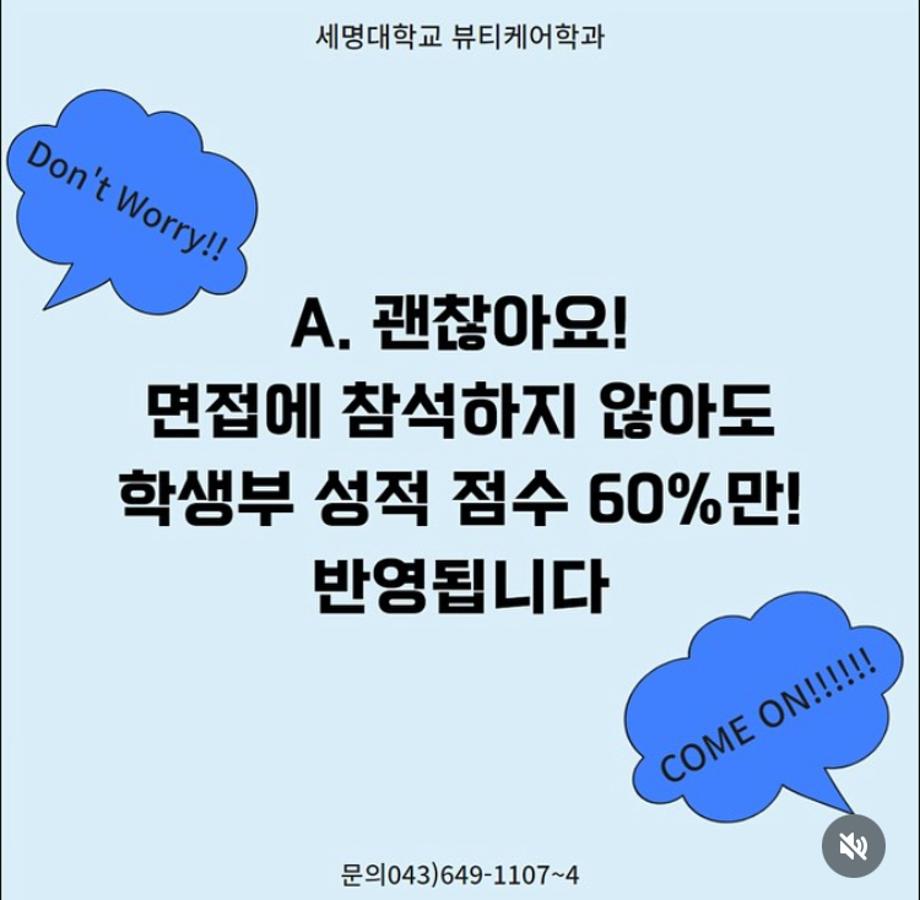 본문 시작 홈으로 커뮤니티 학과소개 교수소개 학과과정 커뮤니티 대학원 홈페이지가이드 포토갤러리 공지사항 채용정보 포토갤러리 Youtube 바로가기 Instargram 바로가기 Blog 바로가기 Facebook 바로가기 포토갤러리 페이스북 트위터 프린트 면접 우수자 전형 바이오코스메틱학과 1741 2024-10-02 📍면접우수자전형 면접에 응시하지 않아도! 괜찮습니다! 걱정하시마세요~ 다만 면접에 참석하지 않을시, 학생부 성적 점수 60%만 반영되니까 꼭 알아두고! 충분히 생각하고 결정합시다!! . 목록 이전043-649-1637 / 2025학년도 예비 신입생 여러분들께 수시 입시 무료 응시쿠폰(진학사,유웨이어플라이무료)을 드립니다. 다음 📣 2025 세명대학교 “뷰티케어학과” 면접우수자전형 면접 일정 📣