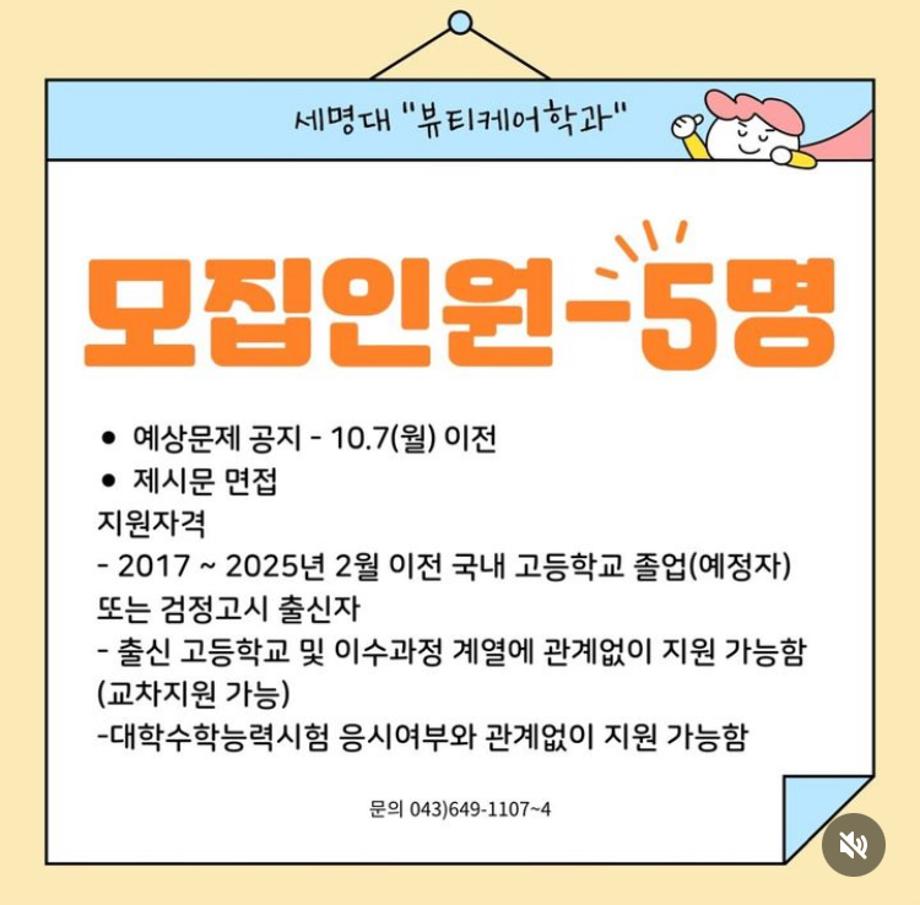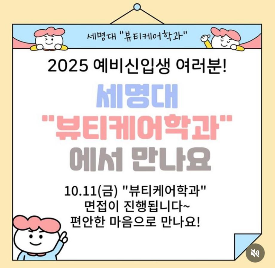 본문 시작 홈으로 커뮤니티 학과소개 교수소개 학과과정 커뮤니티 대학원 홈페이지가이드 포토갤러리 공지사항 채용정보 포토갤러리 Youtube 바로가기 Instargram 바로가기 Blog 바로가기 Facebook 바로가기 포토갤러리 페이스북 트위터 프린트 📣 2025 세명대학교 “뷰티케어학과” 면접우수자전형 면접 일정 📣 바이오코스메틱학과 1885 2024-10-02 📣 2025 세명대학교 “뷰티케어학과” 면접우수자전형 면접 일정 📣 면접우수자전형 면접은 10.11(금) 입니다!! 많은 관심과 지원 부탁드리겠습니다!! 2025 예비 세명인 여러분 “뷰티케어학과” 에서 만나요🫶🏻🫶🏻 목록 이전면접 우수자 전형 다음 헤어기초커트1