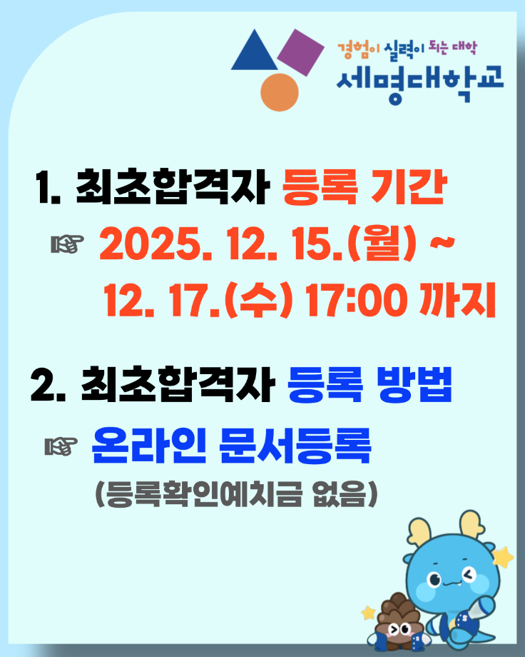 본문 시작 홈으로 커뮤니티 학과소개 교수소개 학과과정 커뮤니티 대학원 홈페이지가이드 포토갤러리 공지사항 채용정보 포토갤러리 Youtube 바로가기 Instargram 바로가기 Blog 바로가기 Facebook 바로가기 포토갤러리 페이스북 트위터 프린트 세명대학교 2026학년도 수시모집 최초합격자 등록 안내 뷰티케어학과 432 2025-12-15 세명대학교 2026학년도 수시모집 최초합격자 등록 안내 목록 이전2025원주뷰티페스티벌 대회 출전 다음 '장서연' 미용사내일 국가자격 합격!