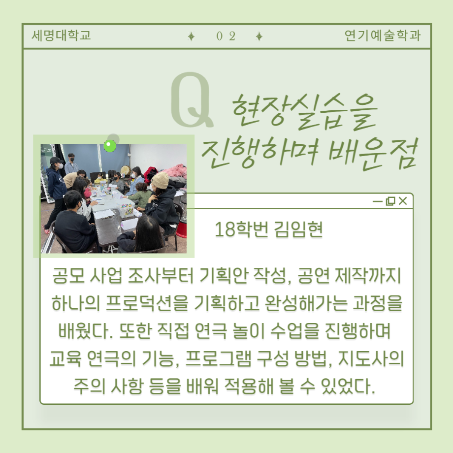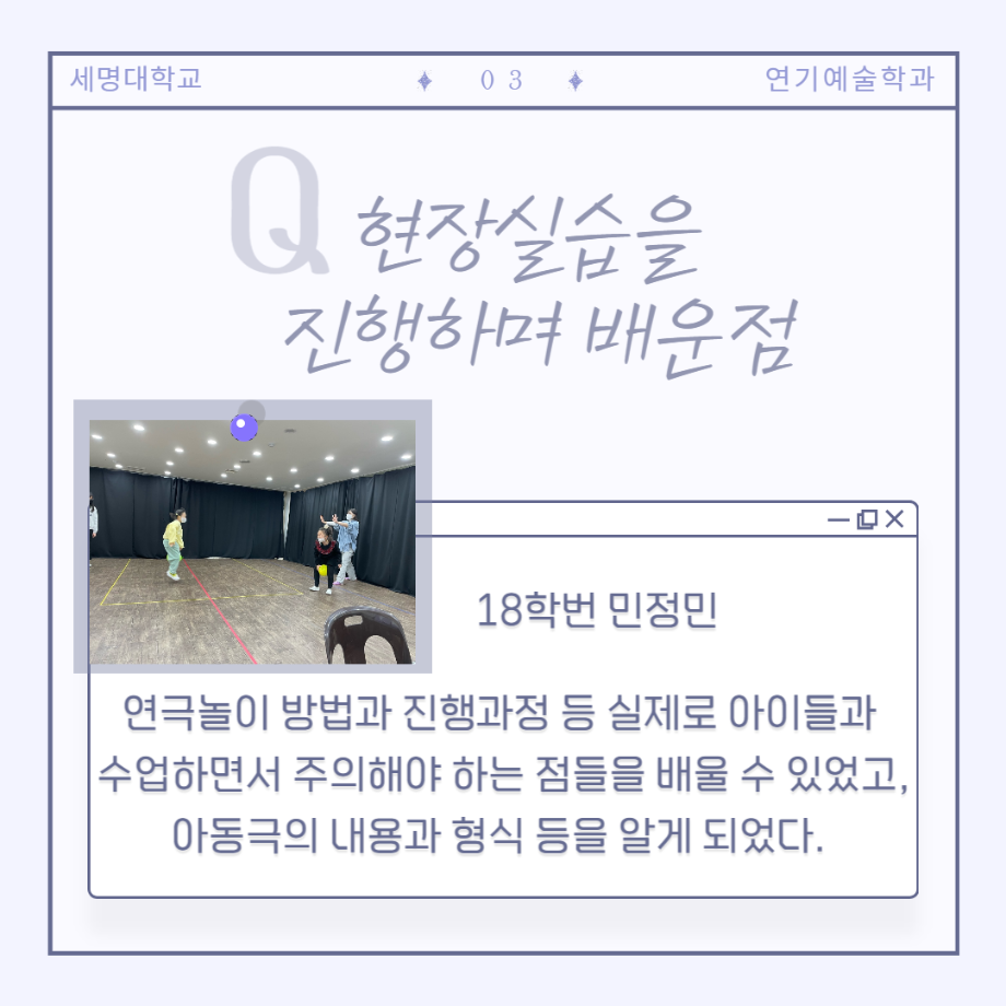 현장실습은 배우, 조명 및 음향, 기획 및 홍보, 프로덕션 제작, 연극 놀이 수업, 아동 교육 등 다양한 경험을 통해 학생들이 더욱 역량을 키워나갈 수 있는 기회를 제공합니다.🎷