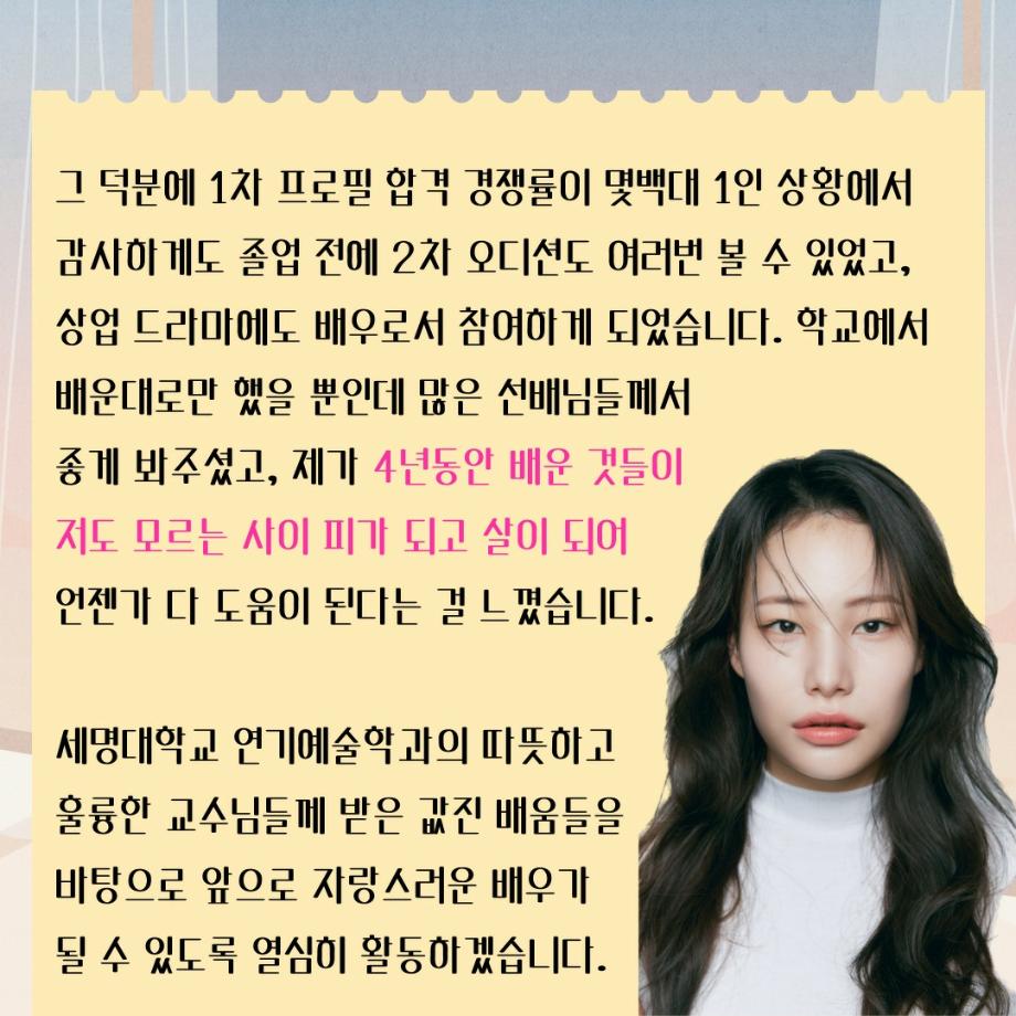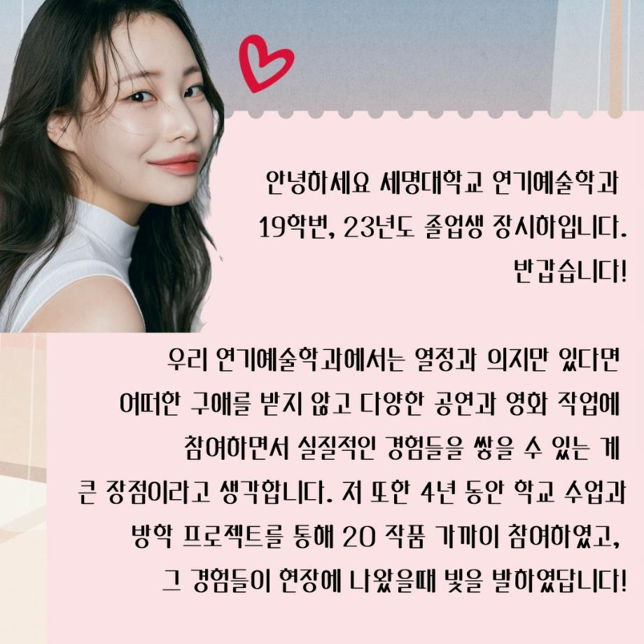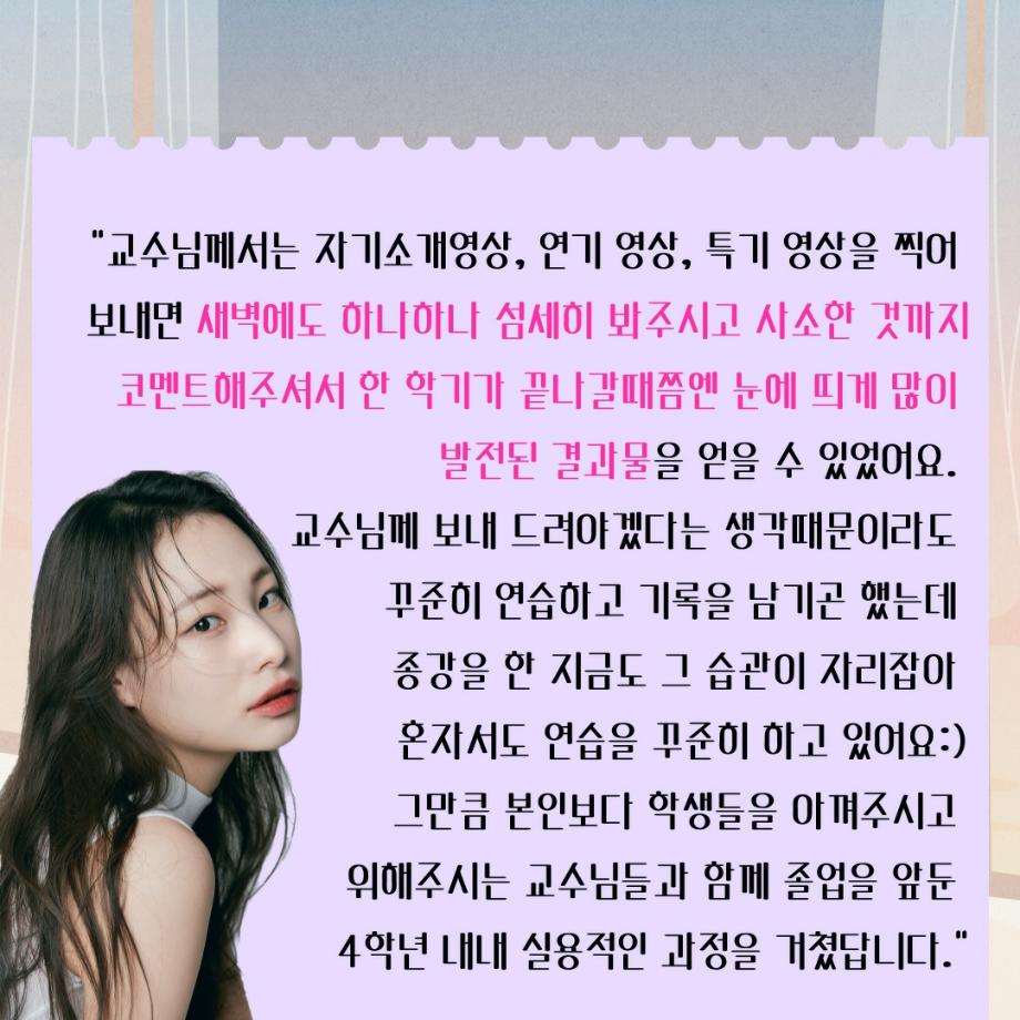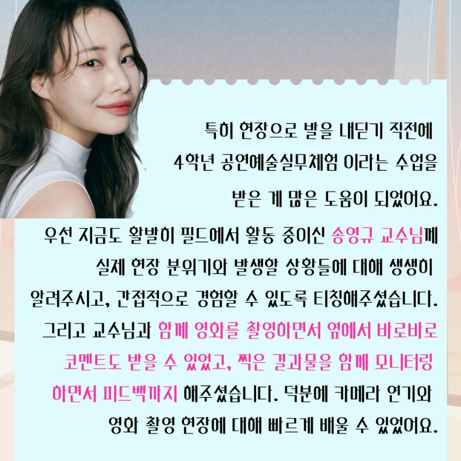 본문 시작 홈으로 커뮤니티 학과소개 입학정보 교수소개 학과과정 커뮤니티 공연예매 안내 홈페이지가이드 포토갤러리 공지사항 포토갤러리 작품DB 동아리 학사일정 학생회 포토갤러리 페이스북 트위터 프린트 [세명대학교 연기예술학과 졸업생 interview] - 장시하편 연기예술학과 2876 2023-02-02 [세명대학교 연기예술학과 졸업생 interview] 23년도 졸업생 19학번 장시하 선배님이 졸업 후에도 좋은 소식으로 재학생들에게 용기와 의지를 끌어올려주셨습니다🔥 23학번 신입생들을 위한 응원의 메세지도 있으니 꼭 확인해 보세요😉😚 다들 이번년도도 힘내서 꿈에 더 가까워지길 바라요🐰 목록 이전[세명대학교 연기예술학과 졸업생 interview] - 유태혁, 유수진편 다음 극단 각인각색 인큐베이팅 공연 - 3/4 (사분의 삼) 담당부서 : 연기예술학과 담당자 : - 연락처 : 043-649-1733 최종수정일 : 2024-10-26 만족도조사 만족도 조사 이 페이지에서 제공하는 정보에 대하여 만족하시나요? 매우만족 만족 보통 불만족 매우불만족