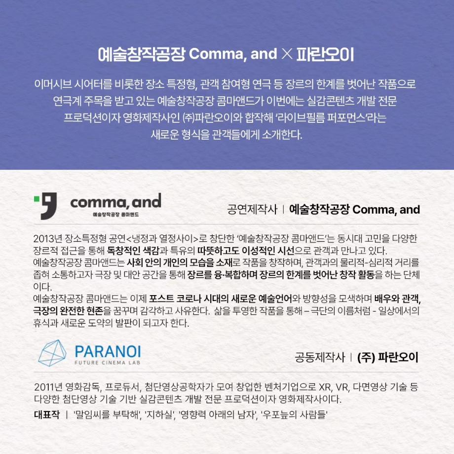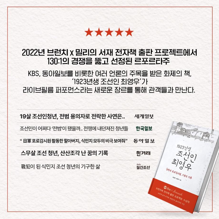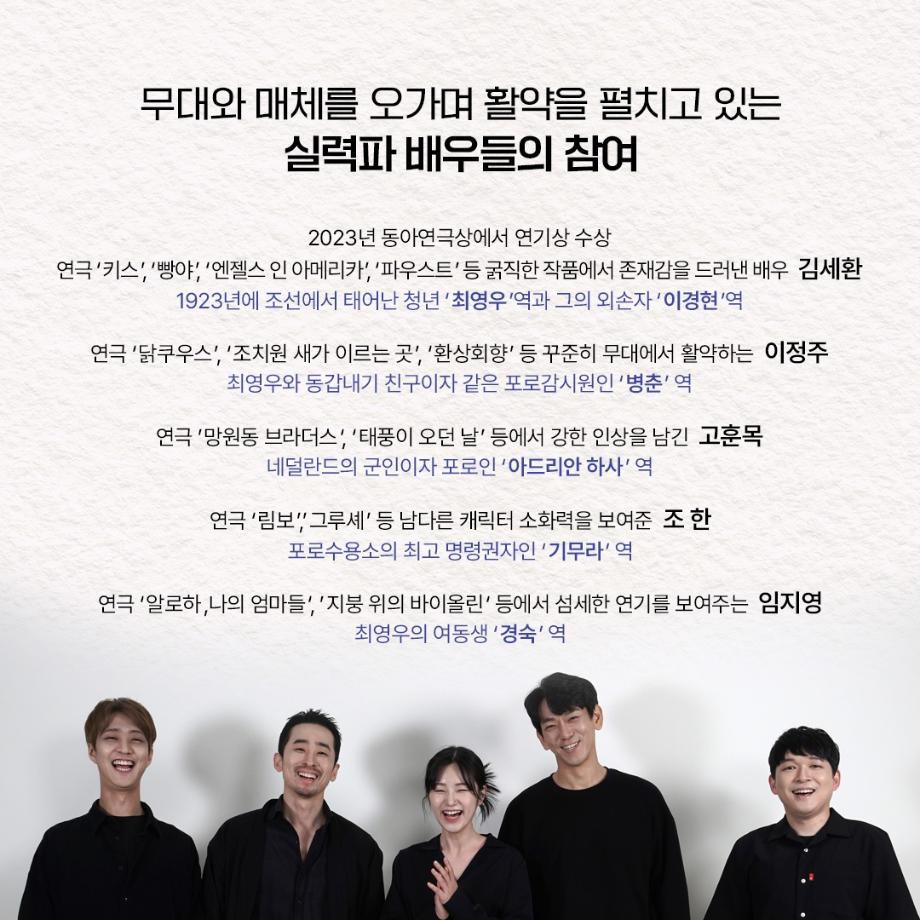 본문 시작 홈으로 커뮤니티 학과소개 입학정보 교수소개 학과과정 커뮤니티 공연예매 안내 홈페이지가이드 포토갤러리 공지사항 포토갤러리 작품DB 동아리 학사일정 학생회 포토갤러리 페이스북 트위터 프린트 이지은 교수님 연출작품 <1923년생 조선인 최영우> 연기예술학과 3504 2023-07-11 이지은(이태린) 교수님이 연출하신 <1923년생 조선인 최영우>가 2023년 한국문화예술위원회 예술과 기술융합 지원사업에 선정되어 이번에 공연을 올립니다. 2023.07.14. - 07.16 금 20:00 / 토 15:00, 19:00 / 일 15:00 동국대 이해랑예술극장 출연 : 김세환, 이정주, 고훈목, 조한, 임지영 극작 : 최양현 / 연출 : 이태린 주최/주관 예술창작공장 콤마앤드 @commaand2013 많은 관심 부탁드립니다. 목록 이전사이와의 인터뷰 - 23년도 조명장 ‘김은경‘ 다음 2023학년도 2학기 표준현장실습 학생신청 안내 담당부서 : 연기예술학과 담당자 : - 연락처 : 043-649-1733 최종수정일 : 2024-10-26 만족도조사 만족도 조사 이 페이지에서 제공하는 정보에 대하여 만족하시나요? 매우만족 만족 보통 불만족 매우불만족