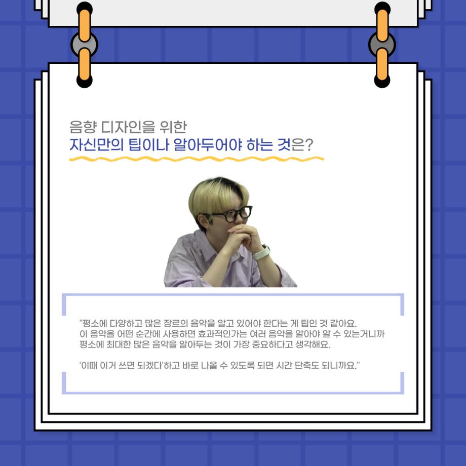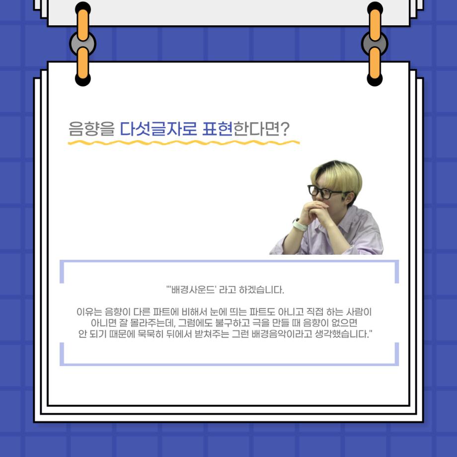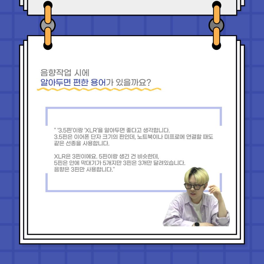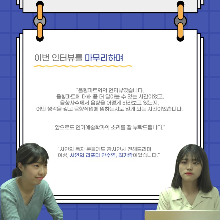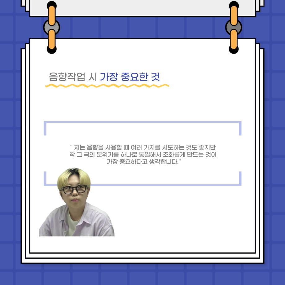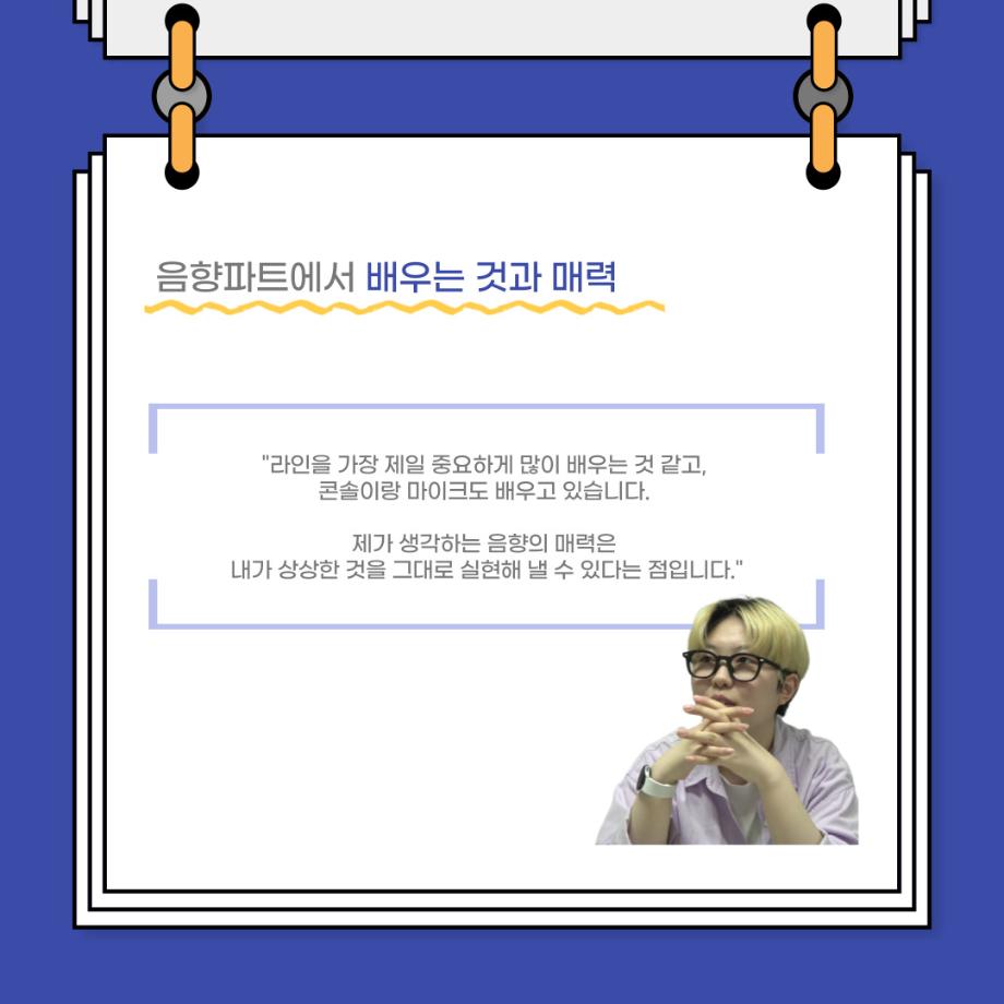 본문 시작 홈으로 커뮤니티 학과소개 입학정보 교수소개 학과과정 커뮤니티 공연예매 안내 홈페이지가이드 포토갤러리 공지사항 포토갤러리 작품DB 동아리 학사일정 학생회 포토갤러리 페이스북 트위터 프린트 사이와의 인터뷰 - 23년도 음향 사수 '임소정' 연기예술학과 3638 2023-08-09 안녕하십니까. 23년도 학회 ‘사이’입니다. 학회 ‘사이’의 여섯번째 인터뷰로 연기예술학과 23년도 음향 사수인 임소정 학생과 인터뷰하는 시간을 가졌습니다. 이번 인터뷰에서는 음향에 대한 매력과 음향 작업에서 가장 중요한 것, 음향 작업에서 알아두어야 하는 것 등에 대해 인터뷰하였습니다. 앞으로 있을 인터뷰 컨텐츠 ‘사인’ 많은 사랑 부탁드립니다. 목록 다음 2023학년도 1학기 하계 현장실습 ‘어드벤쳐프로젝트’ 다음 제14회 서울 청소년 연극축제 담당부서 : 연기예술학과 담당자 : - 연락처 : 043-649-1733 최종수정일 : 2024-10-26 만족도조사 만족도 조사 이 페이지에서 제공하는 정보에 대하여 만족하시나요? 매우만족 만족 보통 불만족 매우불만족