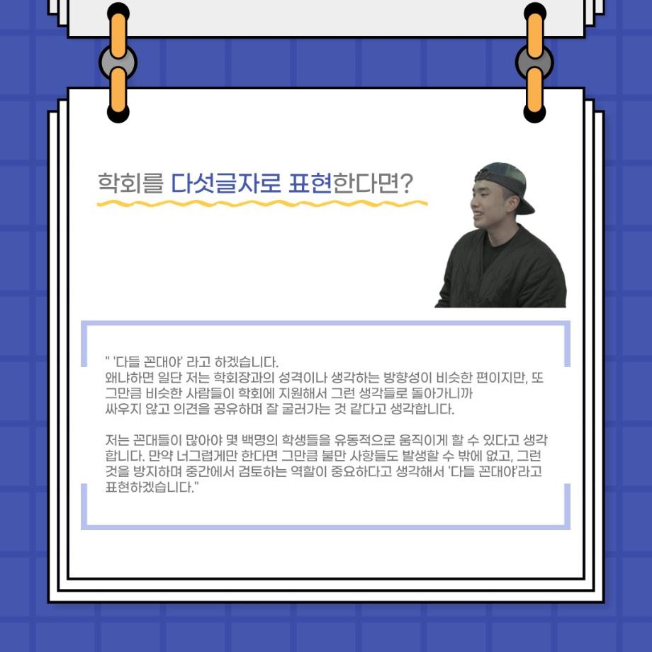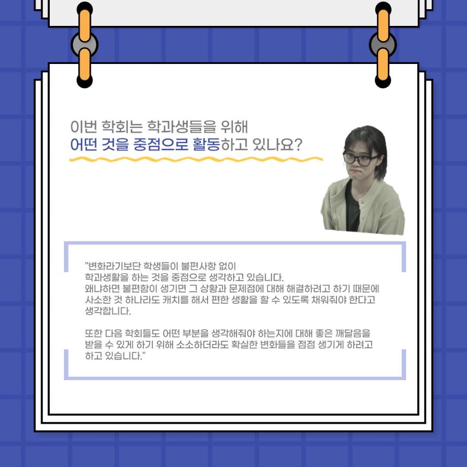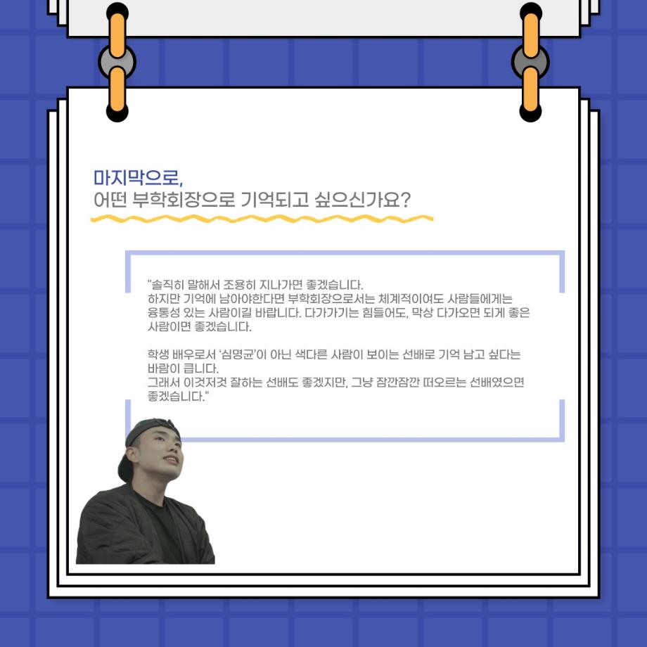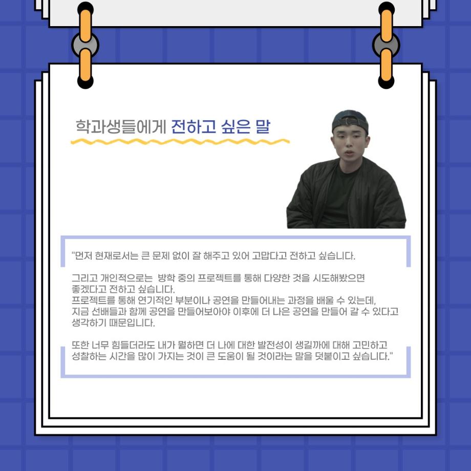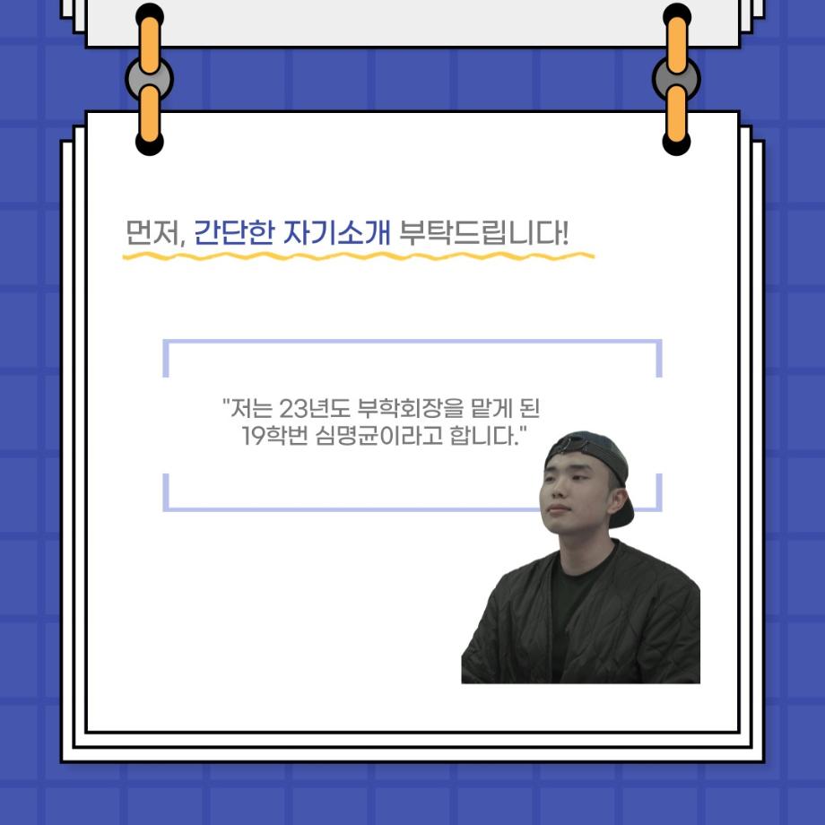 본문 시작 홈으로 커뮤니티 학과소개 입학정보 교수소개 학과과정 커뮤니티 공연예매 안내 홈페이지가이드 포토갤러리 공지사항 포토갤러리 작품DB 동아리 학사일정 학생회 포토갤러리 페이스북 트위터 프린트 사이와의 인터뷰 - 23년도 부학회장 ‘심명균’ 연기예술학과 3325 2023-06-07 안녕하십니까. 23년도 학회 ‘사이’입니다! 학회 ‘사이’의 두번째 인터뷰로 연기예술학과 23년도 부학회장인 심명균 부학회장과 인터뷰하는 시간을 가졌습니다. 학회를 맡은 소감과 부학회장이 되기로 결심한 계기, 학과생들에게 전하고 싶은 말 등 다양한 인터뷰를 진행하였습니다. 다음 인터뷰 컨텐츠 ‘사인’도 많은 사랑 부탁드립니다. 목록 다음 제 97회 세명대학교 연기예술학과 정기공연 '하계 프로젝트' < 첼로와 케찹 > 캐릭터 포스터 다음 사이와의 인터뷰 - 23년도 무대사수 ‘이종화’ 담당부서 : 연기예술학과 담당자 : - 연락처 : 043-649-1733 최종수정일 : 2024-10-26 만족도조사 만족도 조사 이 페이지에서 제공하는 정보에 대하여 만족하시나요? 매우만족 만족 보통 불만족 매우불만족