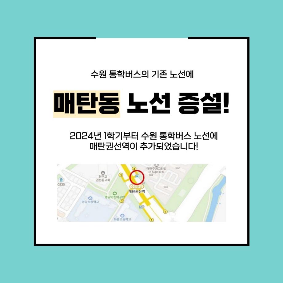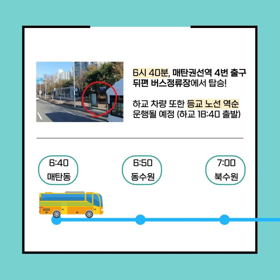 본문 시작 홈으로 커뮤니티 학과소개 입학정보 교수소개 학과과정 커뮤니티 공연예매 안내 홈페이지가이드 포토갤러리 공지사항 포토갤러리 작품DB 동아리 학사일정 학생회 포토갤러리 페이스북 트위터 프린트 세명대 통학버스, 경기 수원지역 노선 증설 연기예술학과 3324 2024-01-30 경기 수원지역 통학버스 노선에 매탄동 노선이 새롭게 증설되었습니다. 6시 40분, 매탄권선역 4번 출구 뒤편 버스정류장에서 탑승해 기존 노선(동수원, 북수원)을 지나 세명대학교까지 단숨에 하교 버스도 등고 버스 노선의 역순으로 운행된다는 사실. 더 편리해진 통학버스 타고 세명대학교로 등교하자. 목록 이전세명대학교 연기예술학과 특강 [최진영 배우님] 다음 세명대학교 연기예술학과 특강 [김낙형 연출가님] 담당부서 : 연기예술학과 담당자 : - 연락처 : 043-649-1733 최종수정일 : 2024-10-26 만족도조사 만족도 조사 이 페이지에서 제공하는 정보에 대하여 만족하시나요? 매우만족 만족 보통 불만족 매우불만족