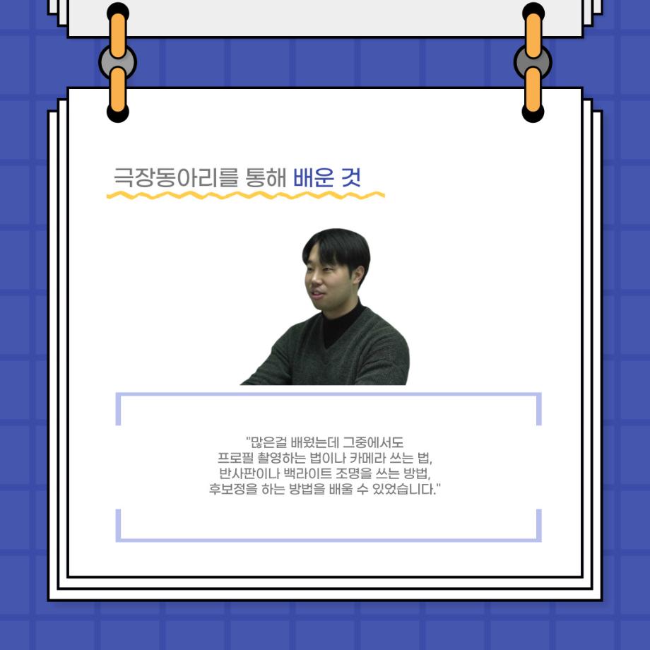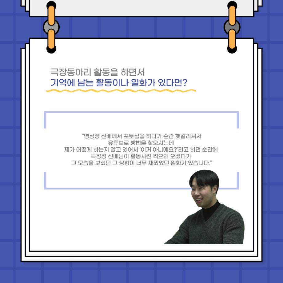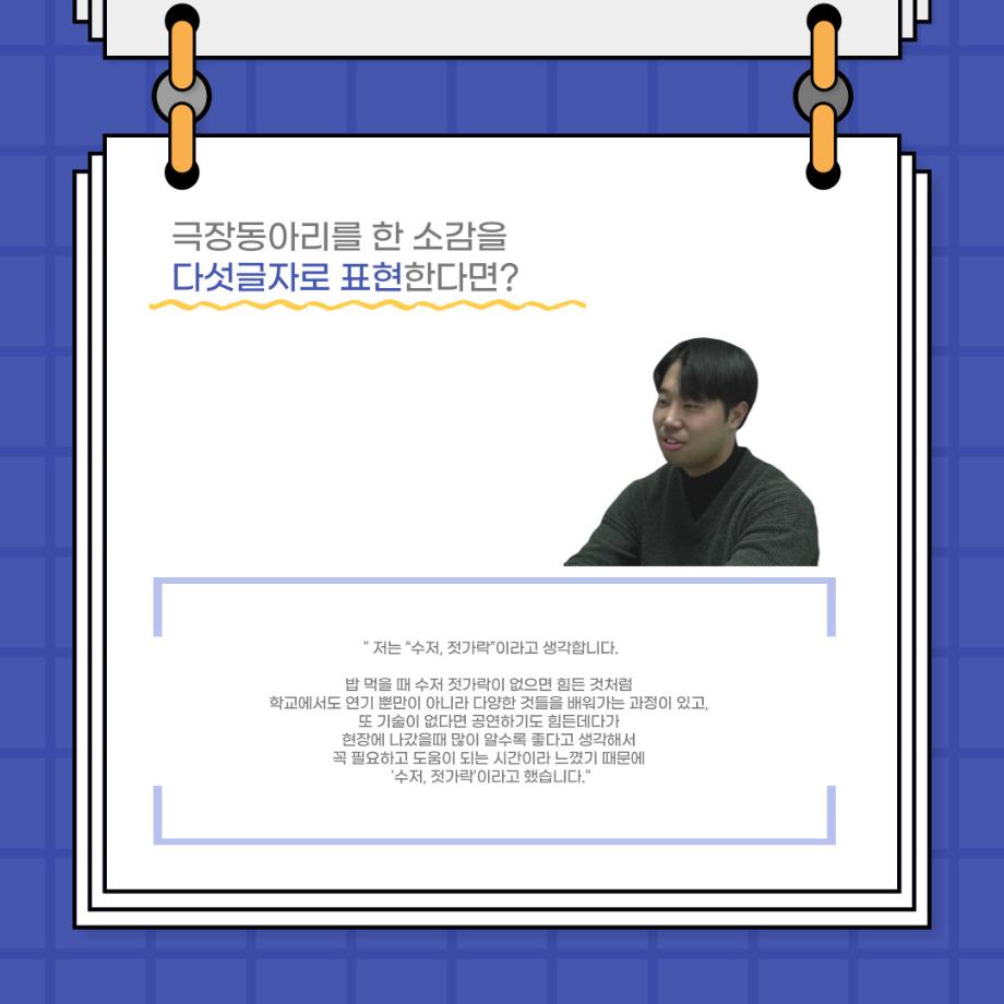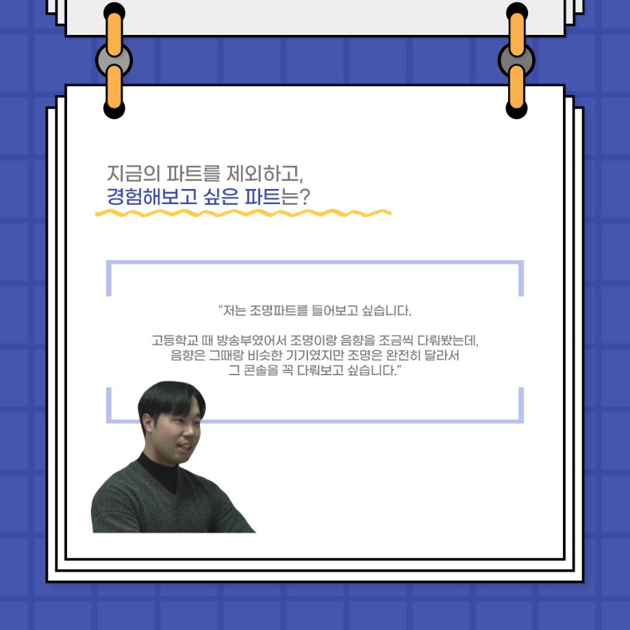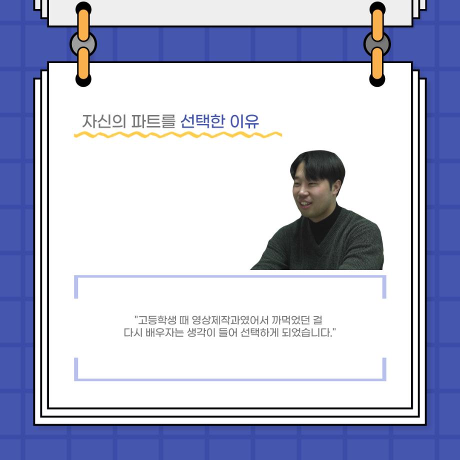 본문 시작 홈으로 커뮤니티 학과소개 입학정보 교수소개 학과과정 커뮤니티 공연예매 안내 홈페이지가이드 포토갤러리 공지사항 포토갤러리 작품DB 동아리 학사일정 학생회 포토갤러리 페이스북 트위터 프린트 사이와의 인터뷰 - 23년도 극장동아리 영상 파트 부원 ‘정태경‘ 연기예술학과 3011 2024-02-02 안녕하십니까. 23년도 학회 ‘사이’입니다. 학회 ‘사이’의 열아홉번째 인터뷰로 연기예술학과 23년도 극장동아리 영상 파트 부원인 정태경 학생과 인터뷰하는 시간을 가졌습니다. 이번 인터뷰에서는 영상파트를 선택한 이유, 극장동아리를 통해 배운 것, 동아리를 하면서 기억에 남는 활동이나 일화 등에 대해 인터뷰하였습니다. 다음 인터뷰 컨텐츠 ‘사인’도 많은 사랑 부탁드립니다. 목록 이전세명대학교 연기예술학과 특강 [김지인 캐스팅 디렉터님] 다음 사이와의 인터뷰 - 23년도 졸업작품 학생연출 ‘박찬우‘ 담당부서 : 연기예술학과 담당자 : - 연락처 : 043-649-1733 최종수정일 : 2024-10-26 만족도조사 만족도 조사 이 페이지에서 제공하는 정보에 대하여 만족하시나요? 매우만족 만족 보통 불만족 매우불만족