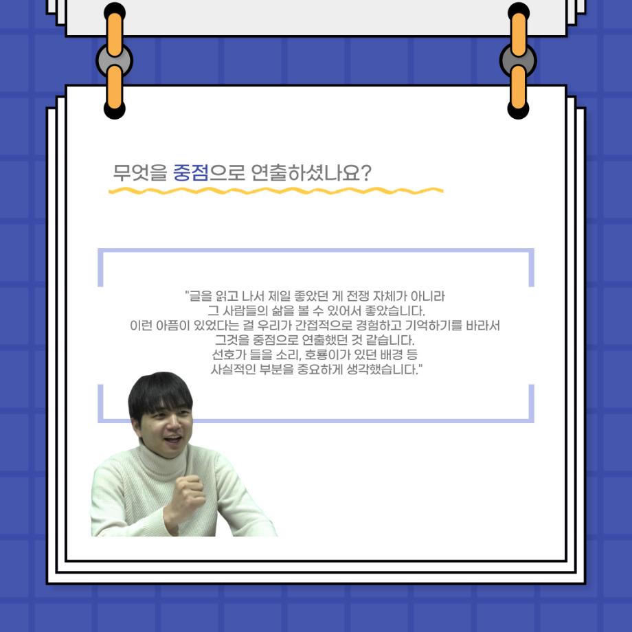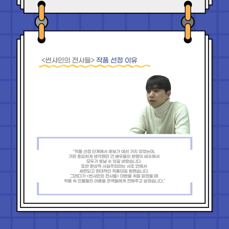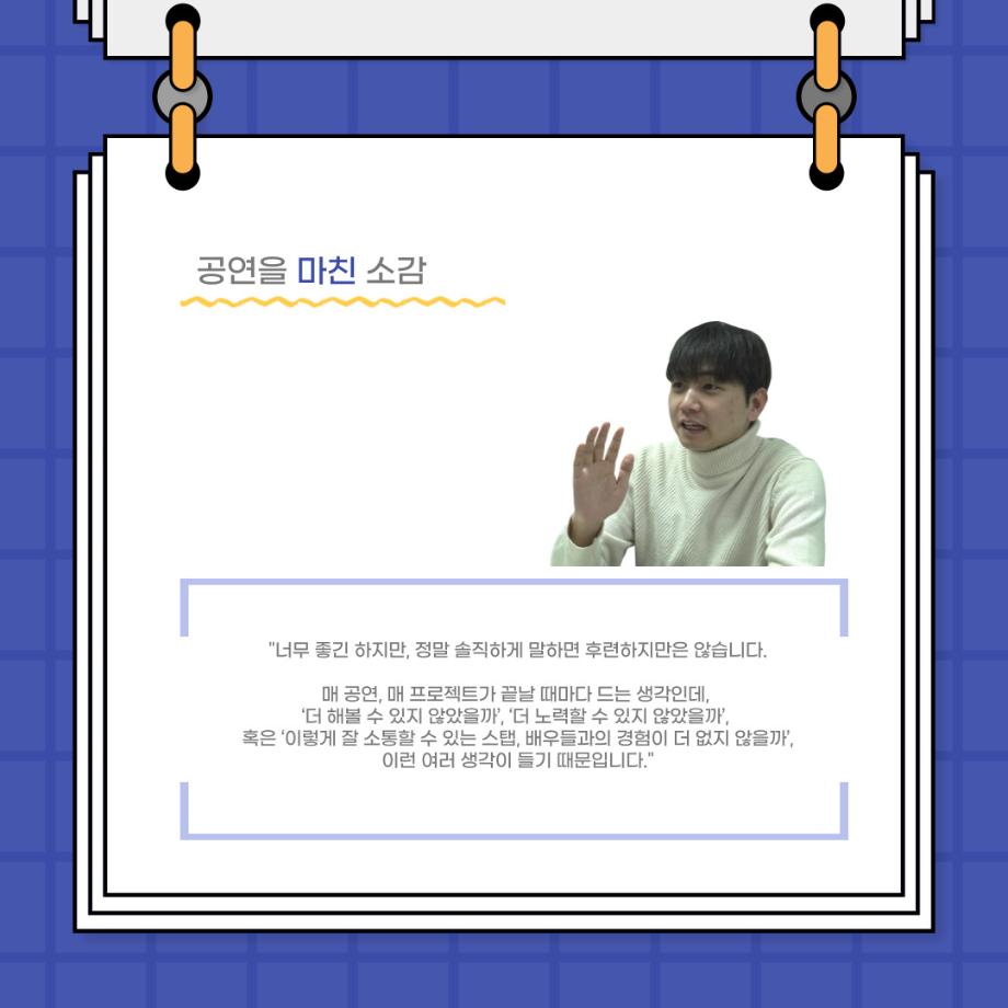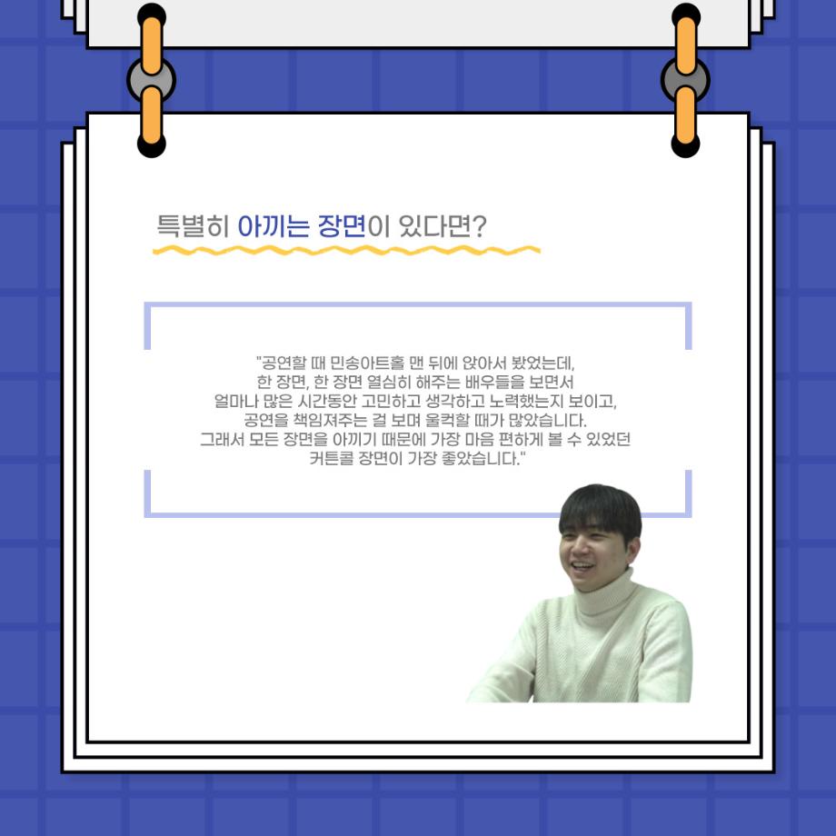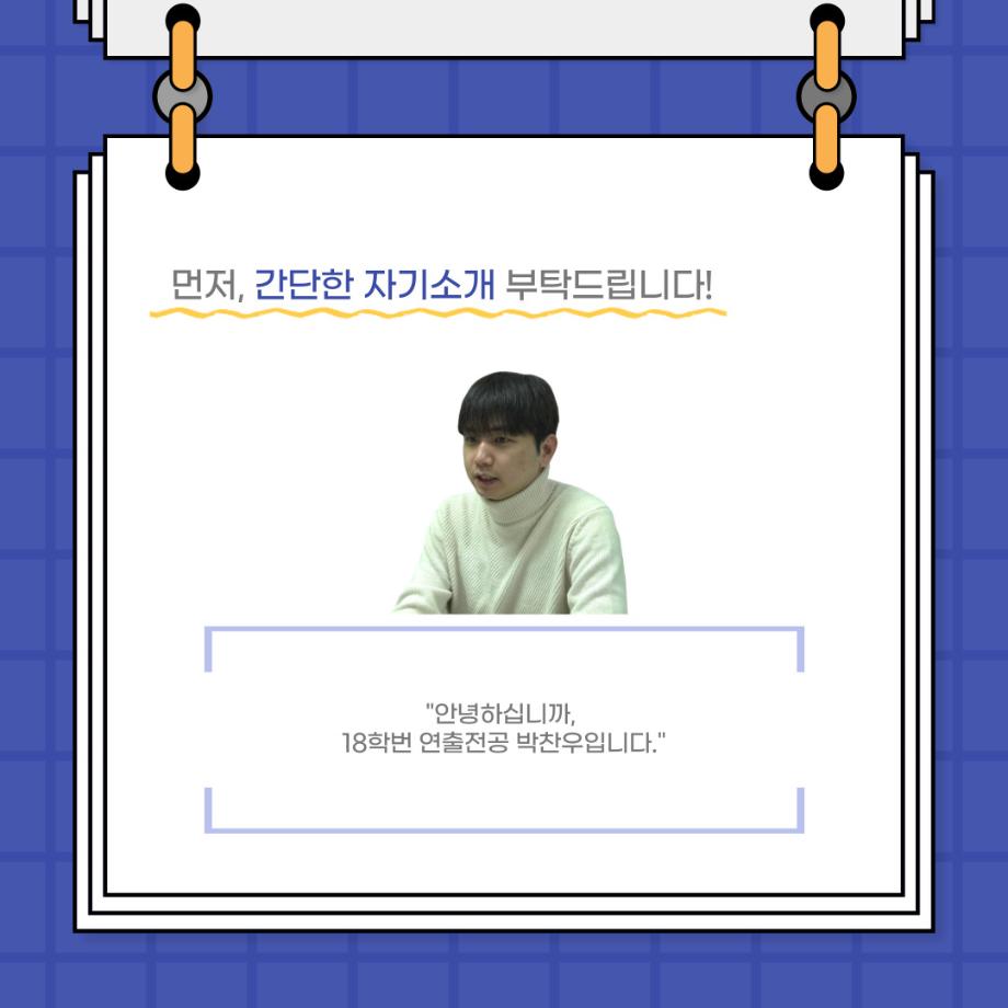 본문 시작 홈으로 커뮤니티 학과소개 입학정보 교수소개 학과과정 커뮤니티 공연예매 안내 홈페이지가이드 포토갤러리 공지사항 포토갤러리 작품DB 동아리 학사일정 학생회 포토갤러리 페이스북 트위터 프린트 사이와의 인터뷰 - 23년도 졸업작품 학생연출 ‘박찬우‘ 연기예술학과 3144 2024-02-05 안녕하십니까. 23년도 학회 ‘사이’입니다. 학회 ‘사이’의 스무번째 인터뷰로 연기예술학과 23년도 졸업작품 <썬샤인의 전사들>의 학생연출인 박찬우 학생과 인터뷰하는 시간을 가졌습니다. 이번 인터뷰에서는 졸업작품 <썬샤인의 전사들>을 선정한 이유, 아끼는 장면, 공연을 마친 소감 등에 대해 인터뷰하였습니다. 다음 인터뷰 컨텐츠 ‘사인’도 많은 사랑 부탁드립니다. 목록 이전사이와의 인터뷰 - 23년도 극장동아리 영상 파트 부원 ‘정태경‘ 다음 사이와의 인터뷰 - 23년도 졸업작품 한승우役 ‘김덕종‘ 담당부서 : 연기예술학과 담당자 : - 연락처 : 043-649-1733 최종수정일 : 2024-10-26 만족도조사 만족도 조사 이 페이지에서 제공하는 정보에 대하여 만족하시나요? 매우만족 만족 보통 불만족 매우불만족