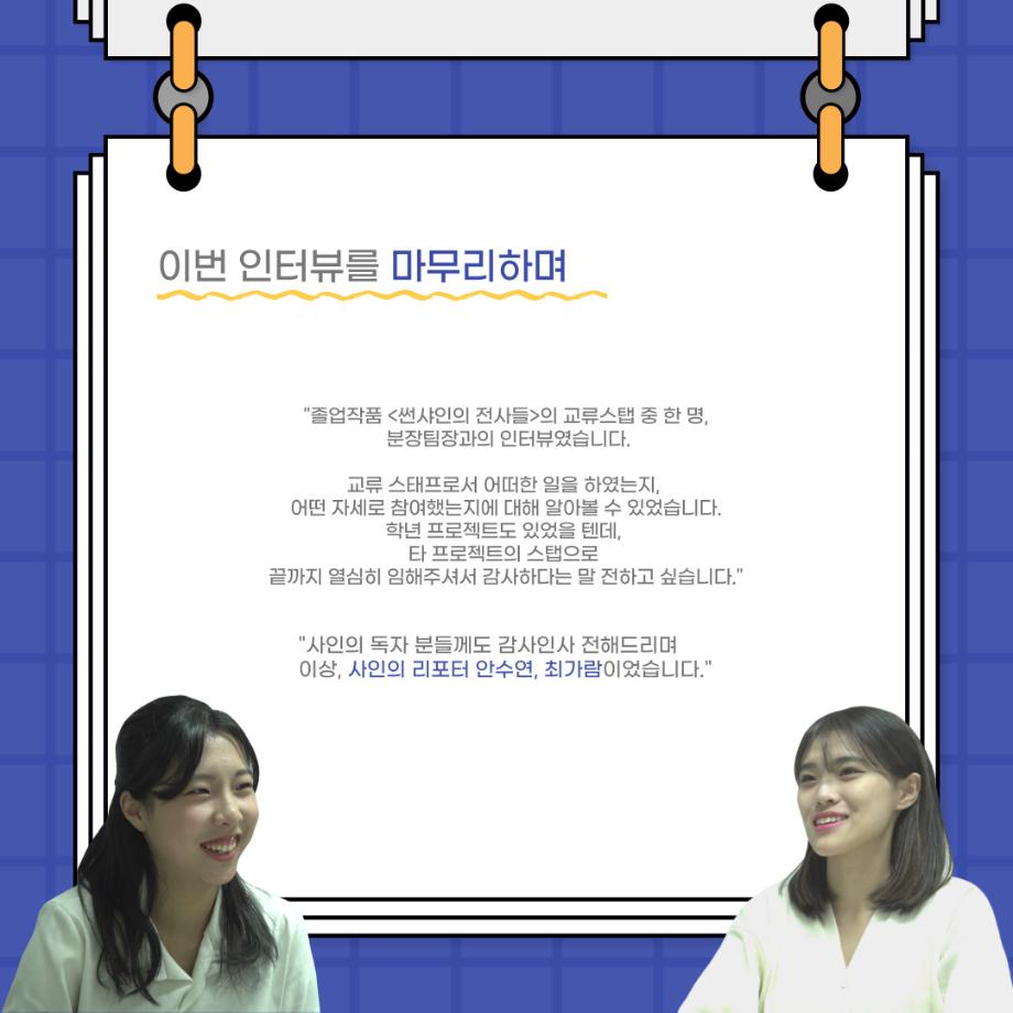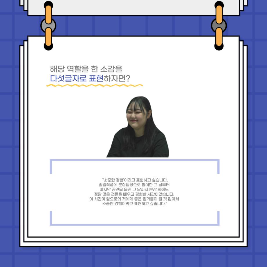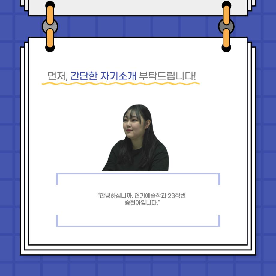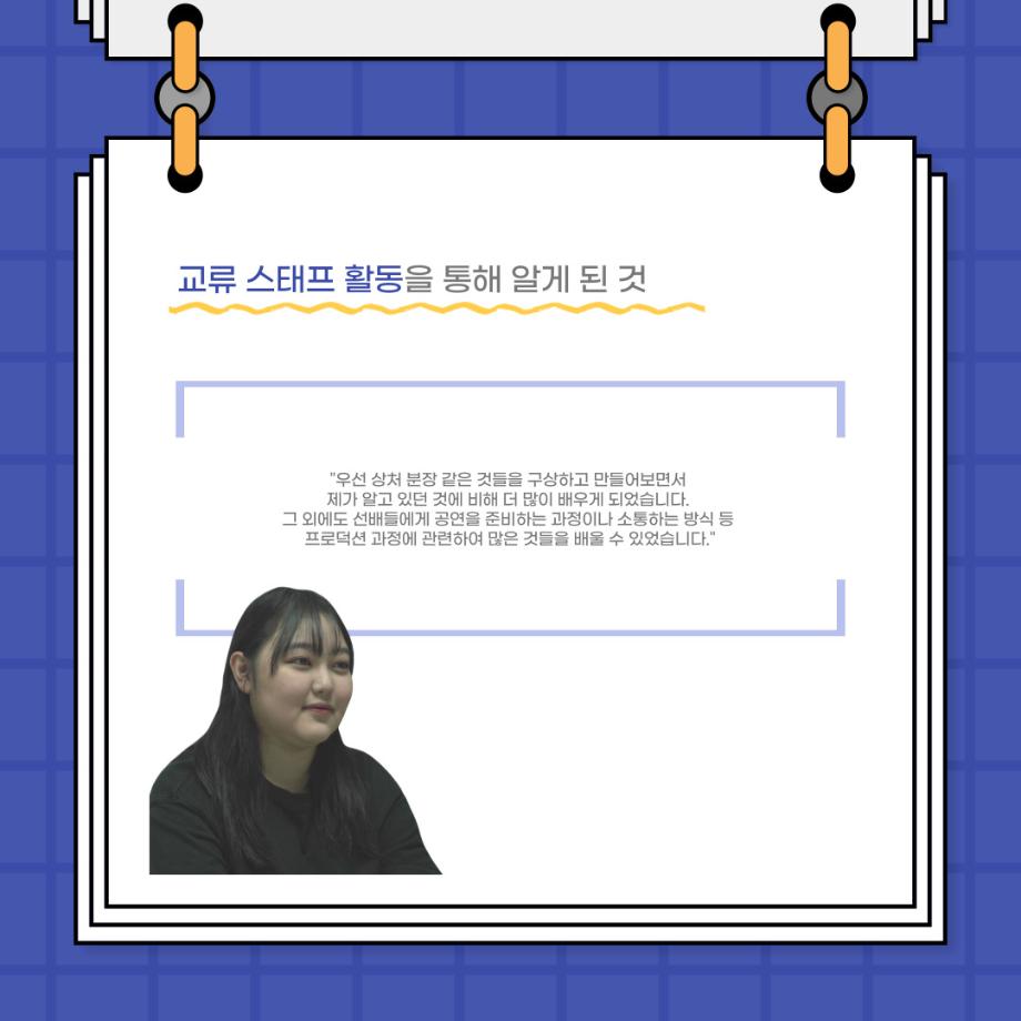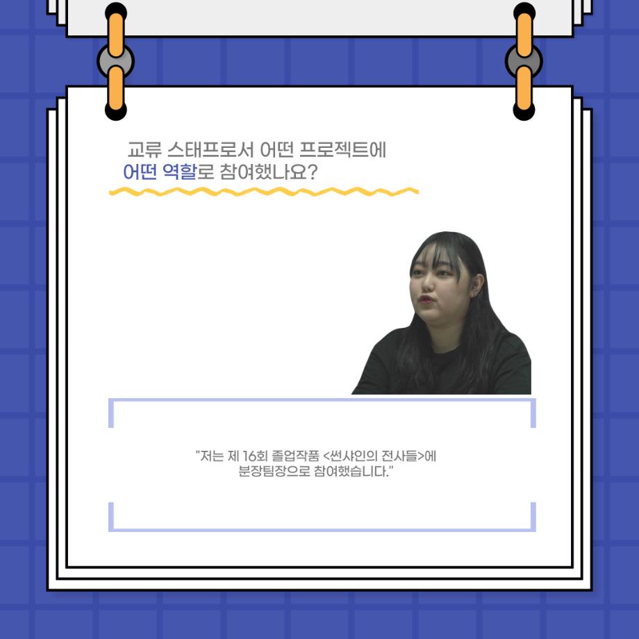본문 시작 홈으로 커뮤니티 학과소개 입학정보 교수소개 학과과정 커뮤니티 공연예매 안내 홈페이지가이드 포토갤러리 공지사항 포토갤러리 작품DB 동아리 학사일정 학생회 포토갤러리 페이스북 트위터 프린트 사이와의 인터뷰 - 23년도 졸업작품 - 교류스탭 분장팀장 ‘송현아’ 연기예술학과 3133 2024-02-12 안녕하십니까. 23년도 학회 ‘사이’입니다. 학회 ‘사이’의 스물네 번째 인터뷰로 연기예술학과 23년도 졸업작품 <썬샤인의 전사들>에서 교류 스탭으로 참여한 송현아 학생과 인터뷰하는 시간을 가졌습니다. 이번 인터뷰에서는 졸업작품 <썬샤인의 전사들> 교류 스탭으로 참여하면서 알게 된 것, 재미있었던 일화, 공연 봤을 때의 기분 등에 대해 인터뷰하였습니다. 다음 인터뷰 컨텐츠 ‘사인’도 많은 사랑 부탁드립니다. 목록 이전사이와의 인터뷰 - 23년도 졸업작품 - 교류스탭 조연출 ‘허승혁’ 다음 연기예술학과 103회 정기공연 동계 프로젝트 <올모스트 메인> 프로필 스틸컷 담당부서 : 연기예술학과 담당자 : - 연락처 : 043-649-1733 최종수정일 : 2024-10-26 만족도조사 만족도 조사 이 페이지에서 제공하는 정보에 대하여 만족하시나요? 매우만족 만족 보통 불만족 매우불만족