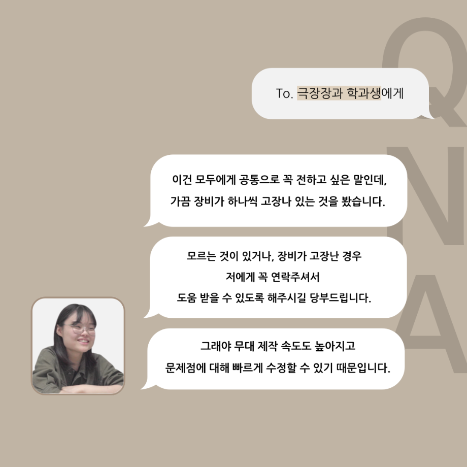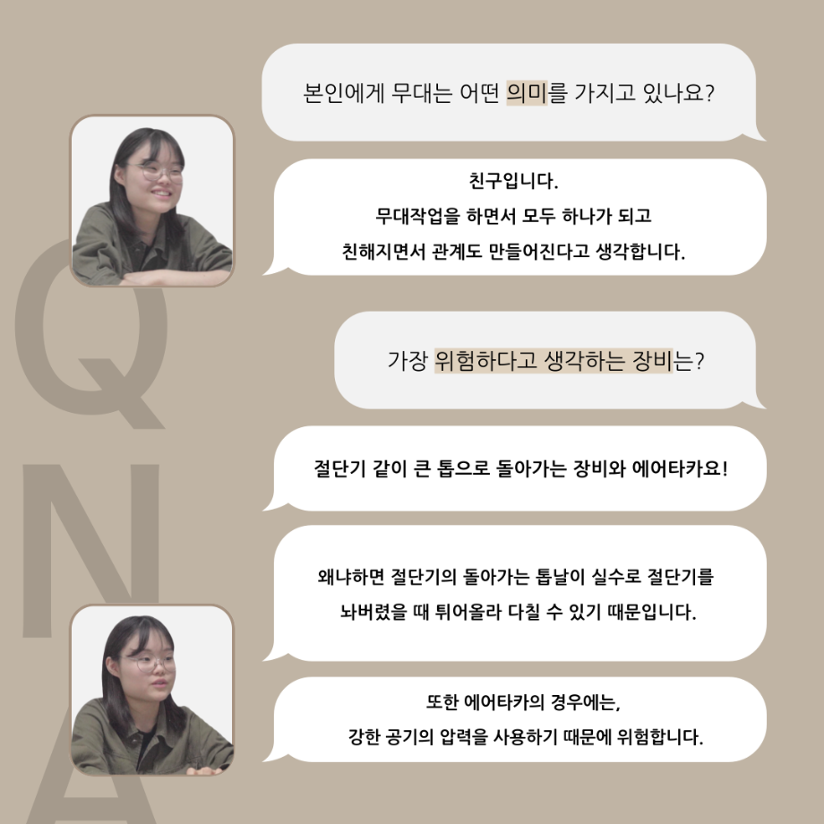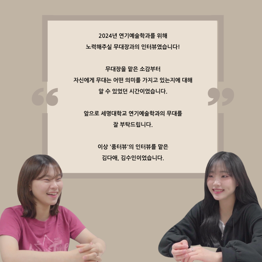 본문 시작 홈으로 커뮤니티 학과소개 입학정보 교수소개 학과과정 커뮤니티 공연예매 안내 홈페이지가이드 포토갤러리 공지사항 포토갤러리 작품DB 동아리 학사일정 학생회 포토갤러리 페이스북 트위터 프린트 '품'위있는 인'터뷰' - 24년도 무대장 <장보배> 연기예술학과 3300 2024-07-16 안녕하십니까. 24년도 학회 ‘품‘ 입니다. 학회 ‘품’의 네 번째 인터뷰로 세명대학교 연기예술학과 24학년도 무대장인 장보배 학우와 인터뷰 하는 시간을 가졌습니다. 무대장을 맡게된 소감과 무대는 어떤 의미가 있는지, 위험한 장비는 무엇이며 극장장과 학과생에게 전하고 싶은 말 등을 질문하는 시간을 가졌습니다. 앞으로 있을 인터뷰 컨텐츠인 ‘품터뷰’ 많은 사랑 부탁드립니다. 목록 이전제5회 대한민국 신직업·미래직업 아이디어 공모전 다음 2024학년도 2학기 표준현장실습 학생신청 안내 담당부서 : 연기예술학과 담당자 : - 연락처 : 043-649-1733 최종수정일 : 2024-10-26 만족도조사 만족도 조사 이 페이지에서 제공하는 정보에 대하여 만족하시나요? 매우만족 만족 보통 불만족 매우불만족
