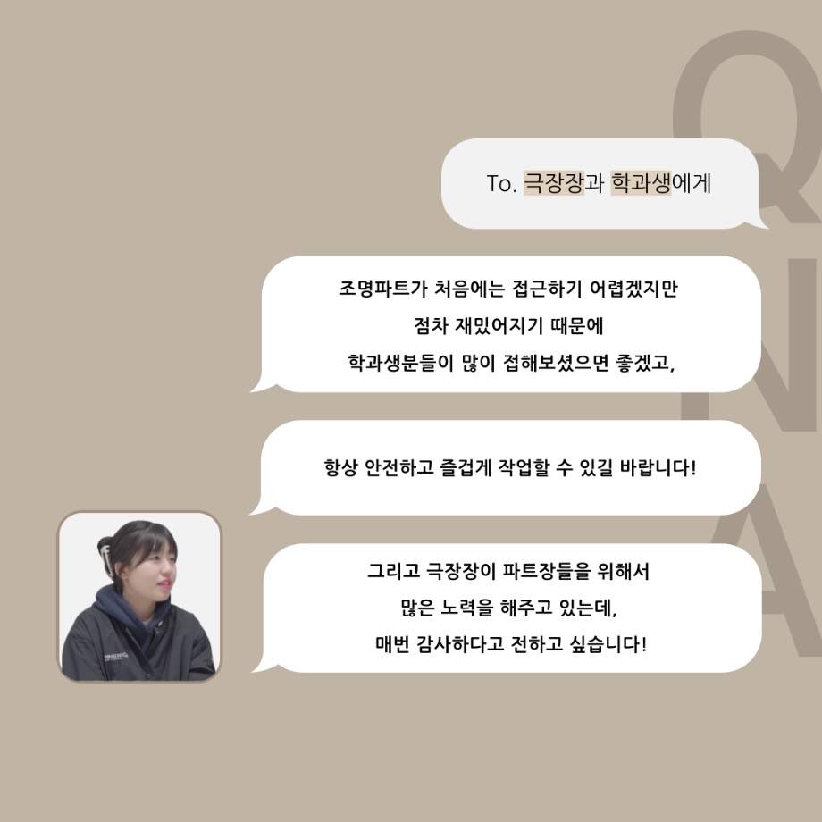 본문 시작 홈으로 커뮤니티 학과소개 입학정보 교수소개 학과과정 커뮤니티 공연예매 안내 홈페이지가이드 포토갤러리 공지사항 포토갤러리 작품DB 동아리 학사일정 학생회 포토갤러리 페이스북 트위터 프린트 '품'위있는 인'터뷰' - 24년도 조명장 <오승아> 연기예술학과 3277 2024-07-22 안녕하십니까. 24년도 학회 ‘품‘ 입니다. 학회 ‘품’의 다섯 번째 인터뷰로 세명대학교 연기예술학과 24학년도 조명장인 오승아 학우와 인터뷰 하는 시간을 가졌습니다. 조명장을 맡게된 소감과 조명은 어떤 의미가 있는지, 조명에서 조심히 해야하는 것은 무엇이며 극장장과 학과생에게 전하고 싶은 말 등을 질문하는 시간을 가졌습니다. 앞으로 있을 인터뷰 컨텐츠인 ‘품터뷰’ 많은 사랑 부탁드립니다. 목록 이전오픈소스 SW 라이선스 교육 안내 다음 장애청년 채용 취업 정보 안내 7월 2차 담당부서 : 연기예술학과 담당자 : - 연락처 : 043-649-1733 최종수정일 : 2024-10-26 만족도조사 만족도 조사 이 페이지에서 제공하는 정보에 대하여 만족하시나요? 매우만족 만족 보통 불만족 매우불만족