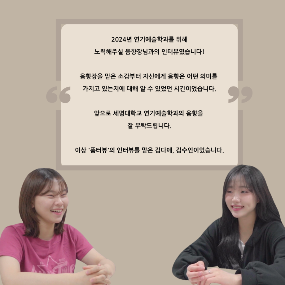 본문 시작 홈으로 커뮤니티 학과소개 입학정보 교수소개 학과과정 커뮤니티 공연예매 안내 홈페이지가이드 포토갤러리 공지사항 포토갤러리 작품DB 동아리 학사일정 학생회 포토갤러리 페이스북 트위터 프린트 '품'위있는 인'터뷰' - 24년도 음향장 <임소정> 연기예술학과 3389 2024-07-24 안녕하십니까. 24년도 학회 ‘품‘ 입니다. 학회 ‘품’의 여섯 번째 인터뷰로 세명대학교 연기예술학과 24학년도 음향장인 임소정 학우와 인터뷰 하는 시간을 가졌습니다. 음향장을 맡게된 소감과 음향은 어떤 의미가 있는지, 음향에서 조심히 해야하는 것은 무엇이며 극장장과 학과생에게 전하고 싶은 말 등을 질문하는 시간을 가졌습니다. 앞으로 있을 인터뷰 컨텐츠인 ‘품터뷰’ 많은 사랑 부탁드립니다. 목록 이전장애청년 채용 취업 정보 안내 7월 2차 다음 [CHARM케어상담센터] 책임지도교수 변경 신청 안내 담당부서 : 연기예술학과 담당자 : - 연락처 : 043-649-1733 최종수정일 : 2024-10-26 만족도조사 만족도 조사 이 페이지에서 제공하는 정보에 대하여 만족하시나요? 매우만족 만족 보통 불만족 매우불만족