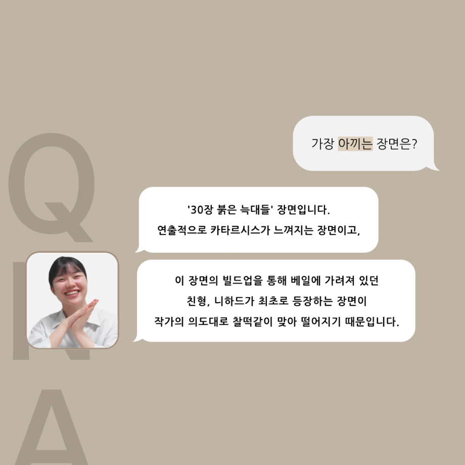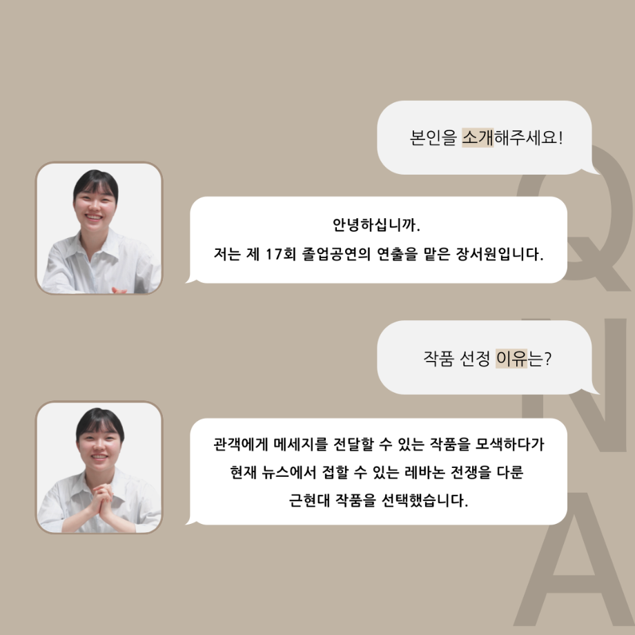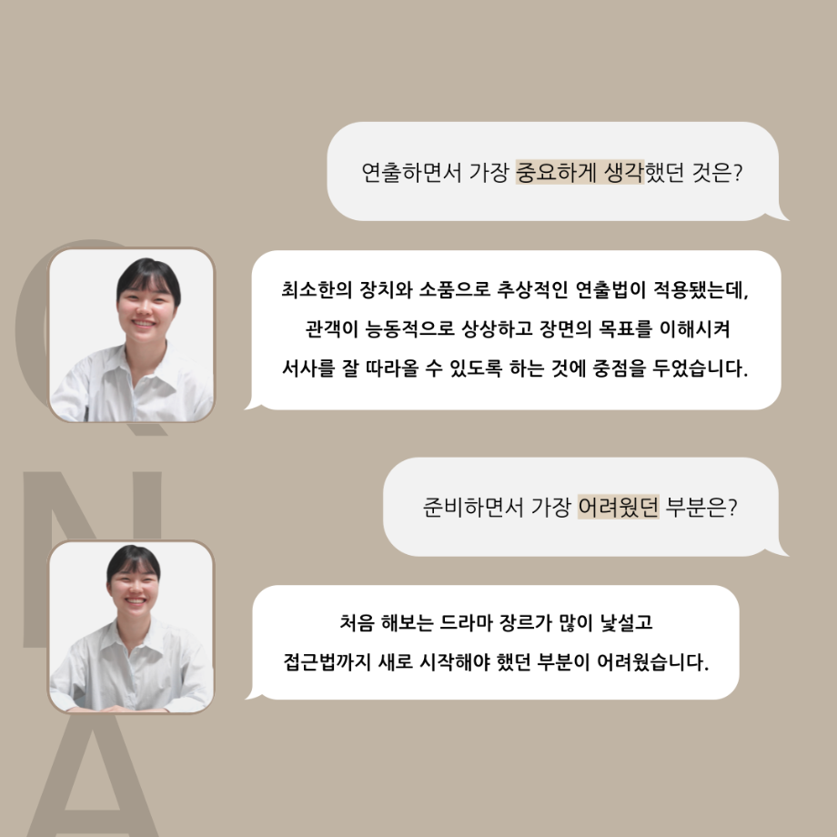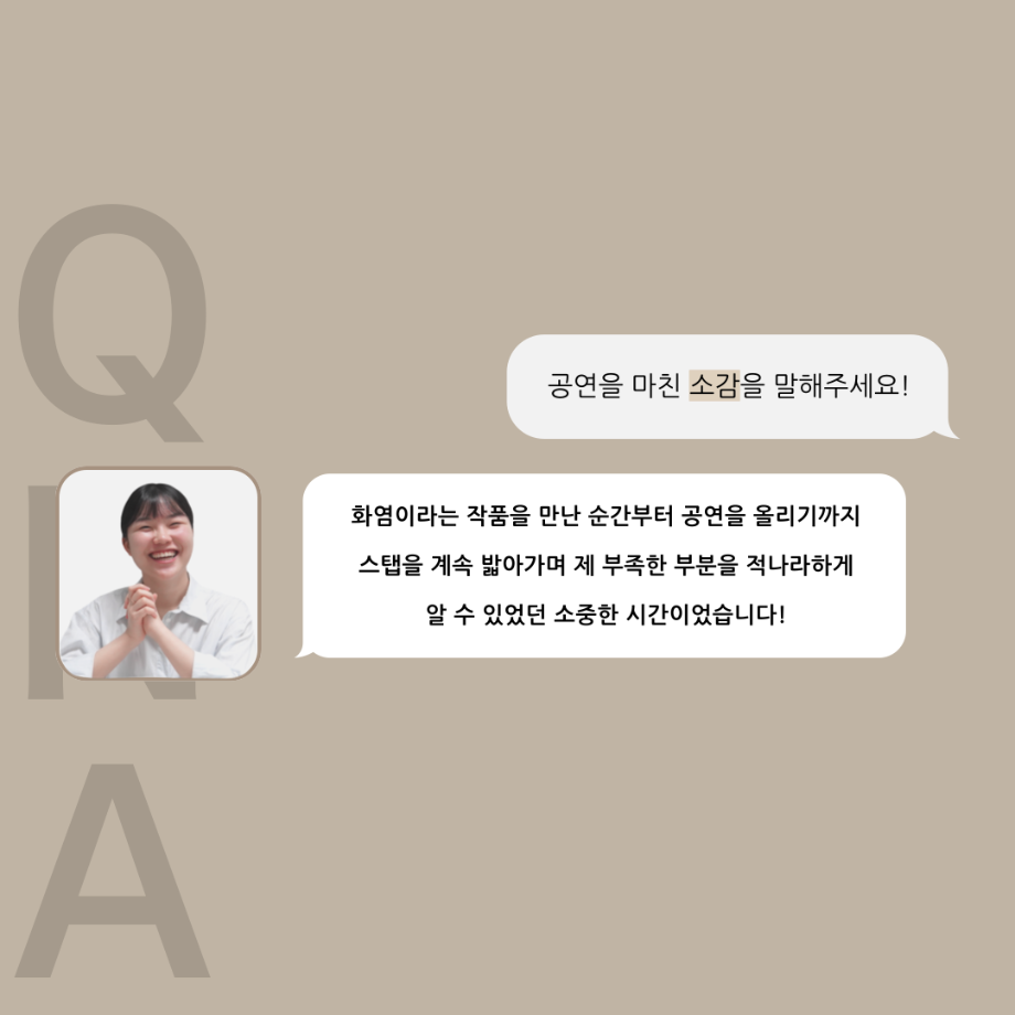 본문 시작 홈으로 커뮤니티 학과소개 입학정보 교수소개 학과과정 커뮤니티 공연예매 안내 홈페이지가이드 포토갤러리 공지사항 포토갤러리 작품DB 동아리 학사일정 학생회 포토갤러리 페이스북 트위터 프린트 ‘품’위있는 인‘터뷰’ - 24년도 졸업작품 학생 연출 <장서원> 연기예술학과 3058 2024-12-04 안녕하십니까. 24년도 학회 ‘품’ 입니다. 학회 ‘품’의 열 여섯 번째 인터뷰로 세명대학교 연기예술학과 제 17회 졸업작품 <화염>의 학생 연출 장서원 학우와 인터뷰 하는 시간을 가졌습니다. 작품 선정 이유부터 아끼는 장면, 연출하면서 가장 중요하게 생각했던 장면과 작품을 준비하면서 어려웠던 부분에 대해 알 수 있는 시간을 가졌습니다. 앞으로 있을 인터뷰 컨텐츠인 ‘품터뷰’ 많은 사랑 부탁드립니다. 목록 이전제 111회 세명대학교 연기예술학과 뮤지컬제작실습 <All Shook Up> 스케줄표 다음 [24학번 1학년 대상] 비전 프로젝트 경험 교육_비전 포트폴리오 작성 안내 담당부서 : 연기예술학과 담당자 : - 연락처 : 043-649-1733 최종수정일 : 2024-10-26 만족도조사 만족도 조사 이 페이지에서 제공하는 정보에 대하여 만족하시나요? 매우만족 만족 보통 불만족 매우불만족