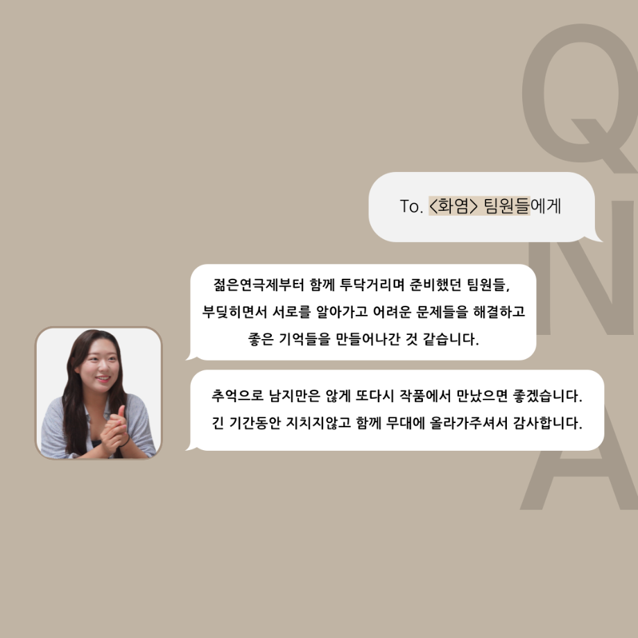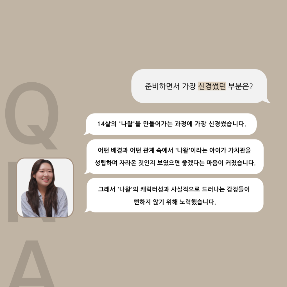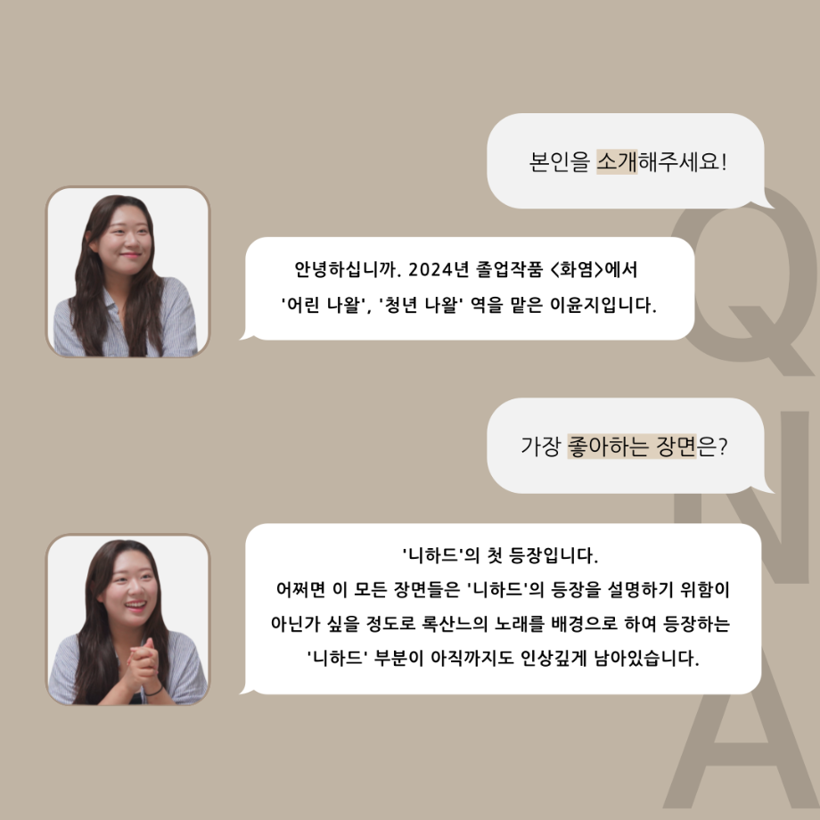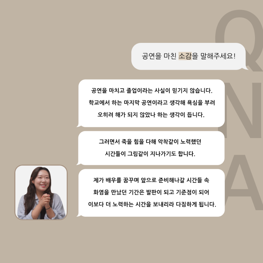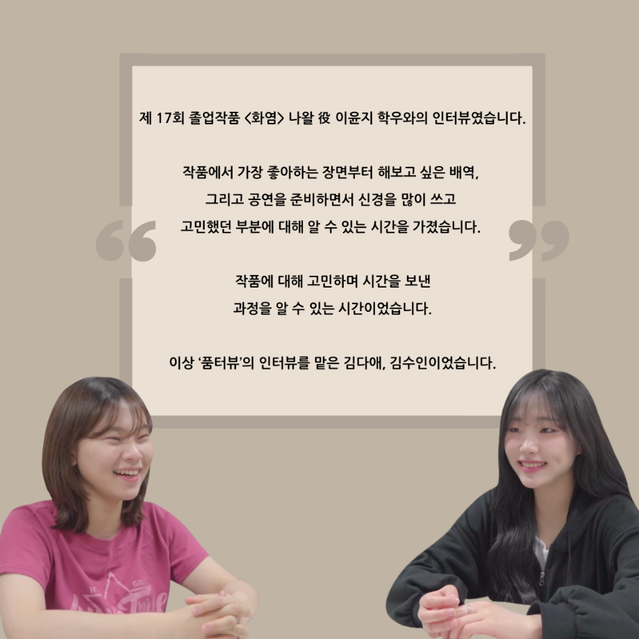 본문 시작 홈으로 커뮤니티 학과소개 입학정보 교수소개 학과과정 커뮤니티 공연예매 안내 홈페이지가이드 포토갤러리 공지사항 포토갤러리 작품DB 동아리 학사일정 학생회 포토갤러리 페이스북 트위터 프린트 ‘품’위있는 인‘터뷰’ - 24년도 졸업작품 어린나왈 役 <이윤지> 연기예술학과 3271 2024-12-19 안녕하십니까. 24년도 학회 ‘품’ 입니다. 학회 ‘품’의 열 일곱 번째 인터뷰로 세명대학교 연기예술학과 제 17회 졸업작품 <화염>의 어린 나왈 역인 이윤지 학우와 인터뷰 하는 시간을 가졌습니다. 가장 좋아하는 장면, 자신의 배역을 제외하고 해보고 싶은 배역 그리고 준비하면서 어려웠던 부분과 공연을 마친 소감 등에 대해 인터뷰 하는 시간을 가졌습니다. 앞으로 있을 인터뷰 컨텐츠인 ‘품터뷰’ 많은 사랑 부탁드립니다. 목록 이전세명대학교 연기예술학과 종강총회 다음 ‘품’위있는 인‘터뷰’ - 24년도 졸업작품 르벨 役 <정성주> 담당부서 : 연기예술학과 담당자 : - 연락처 : 043-649-1733 최종수정일 : 2024-10-26 만족도조사 만족도 조사 이 페이지에서 제공하는 정보에 대하여 만족하시나요? 매우만족 만족 보통 불만족 매우불만족