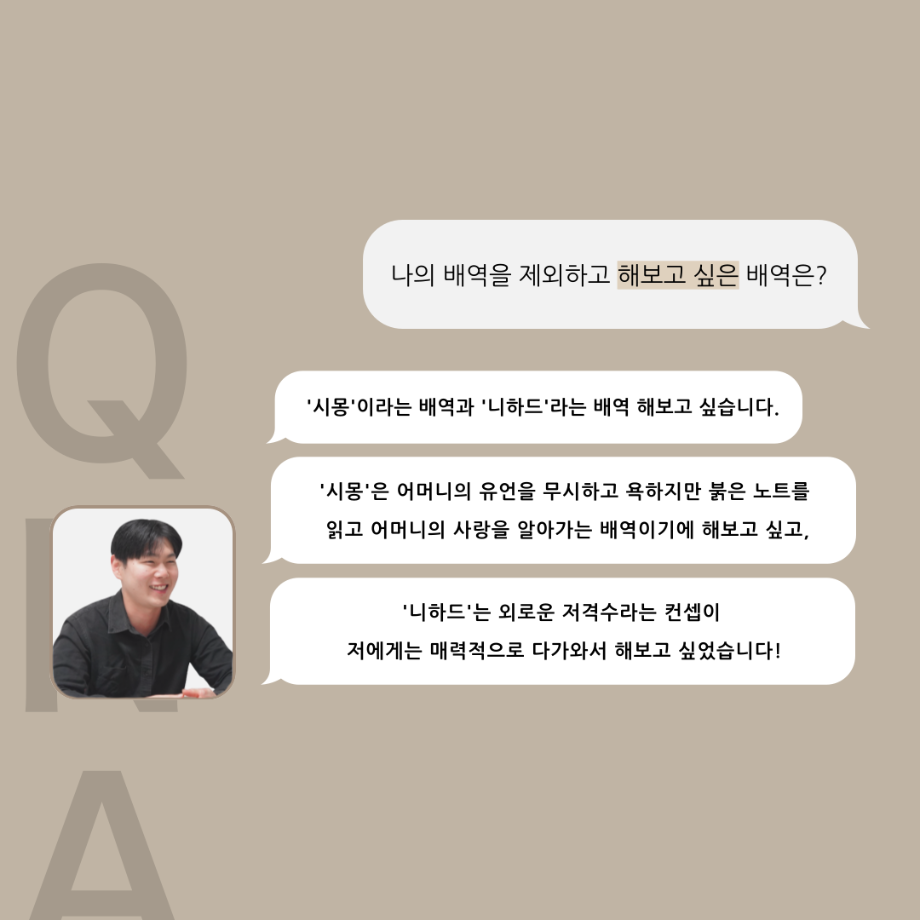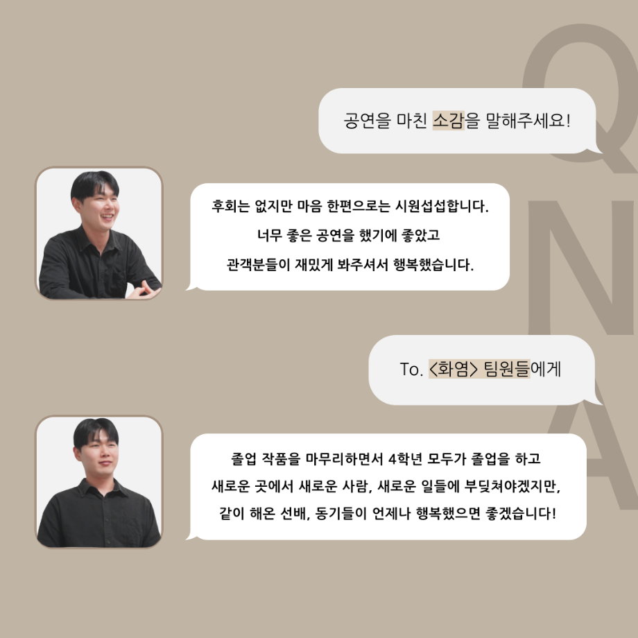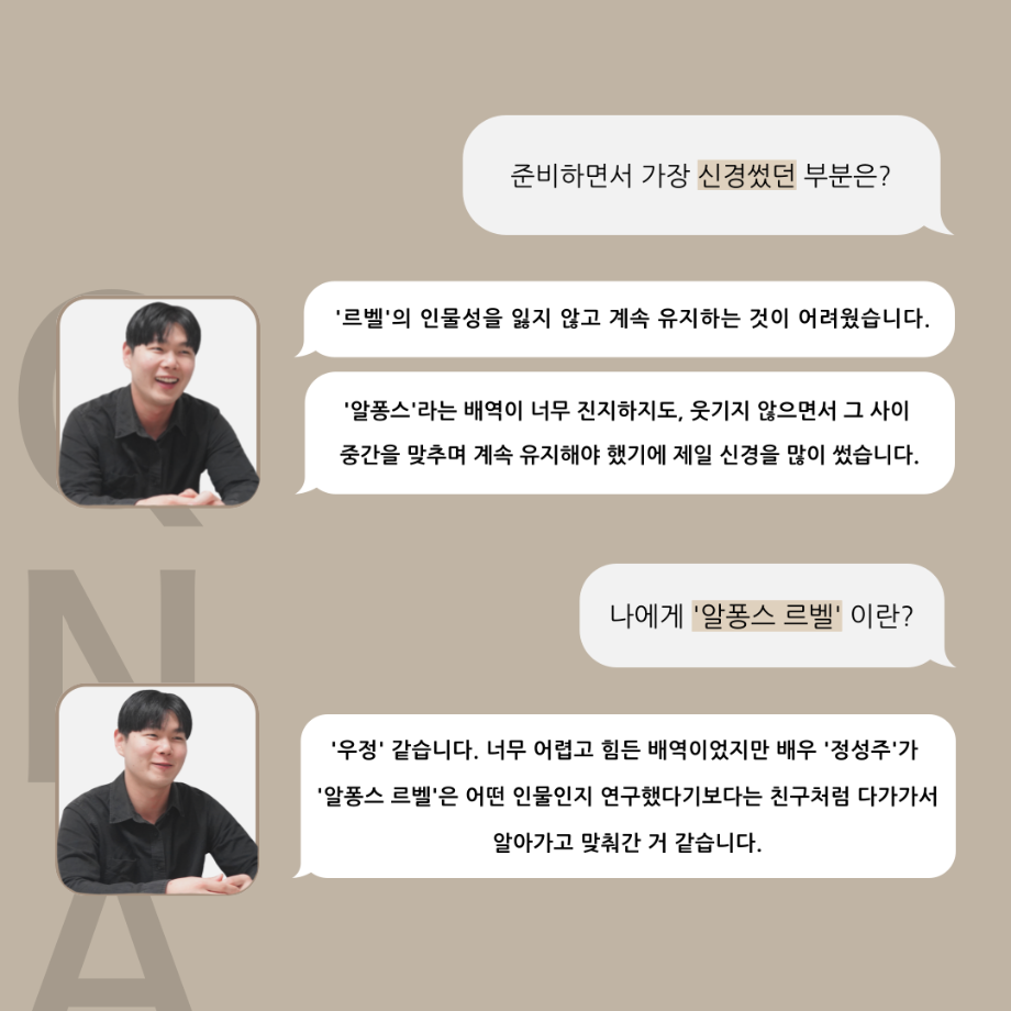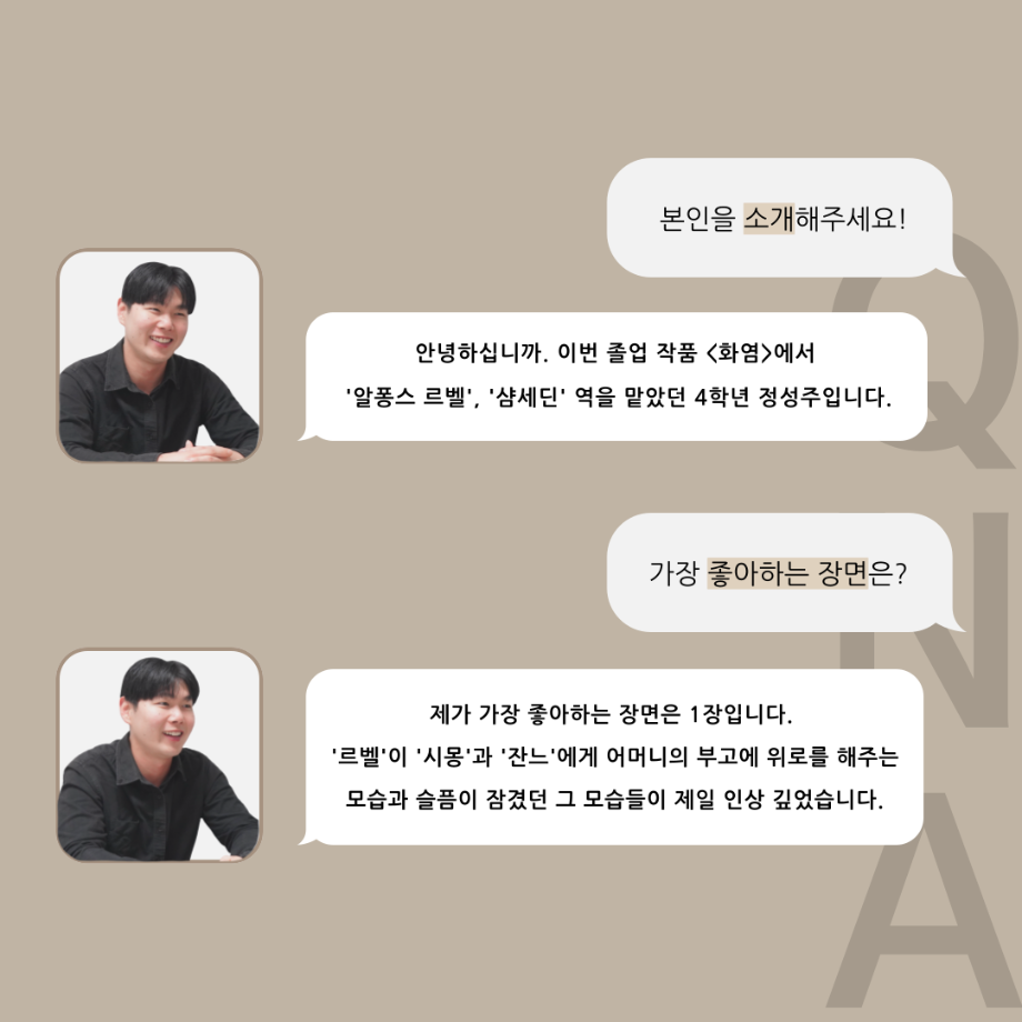 본문 시작 홈으로 커뮤니티 학과소개 입학정보 교수소개 학과과정 커뮤니티 공연예매 안내 홈페이지가이드 포토갤러리 공지사항 포토갤러리 작품DB 동아리 학사일정 학생회 포토갤러리 페이스북 트위터 프린트 ‘품’위있는 인‘터뷰’ - 24년도 졸업작품 르벨 役 <정성주> 연기예술학과 3379 2024-12-20 안녕하십니까. 24년도 학회 ‘품’ 입니다. 학회 ‘품’의 열 여덟 번째 인터뷰로 세명대학교 연기예술학과 제 17회 졸업작품 <화염>의 르벨 역인 정성주 학우와 인터뷰 하는 시간을 가졌습니다. 가장 좋아하는 장면, 자신의 배역을 제외하고 해보고 싶은 배역 그리고 준비하면서 어려웠던 부분과 공연을 마친 소감 등에 대해 인터뷰 하는 시간을 가졌습니다. 앞으로 있을 인터뷰 컨텐츠인 ‘품터뷰’ 많은 사랑 부탁드립니다. 목록 이전‘품’위있는 인‘터뷰’ - 24년도 졸업작품 어린나왈 役 <이윤지> 다음 ‘품’위있는 인‘터뷰’ - 24년도 졸업작품 잔느 役 <최희진> 담당부서 : 연기예술학과 담당자 : - 연락처 : 043-649-1733 최종수정일 : 2024-10-26 만족도조사 만족도 조사 이 페이지에서 제공하는 정보에 대하여 만족하시나요? 매우만족 만족 보통 불만족 매우불만족
