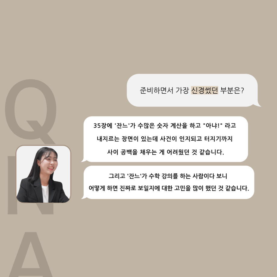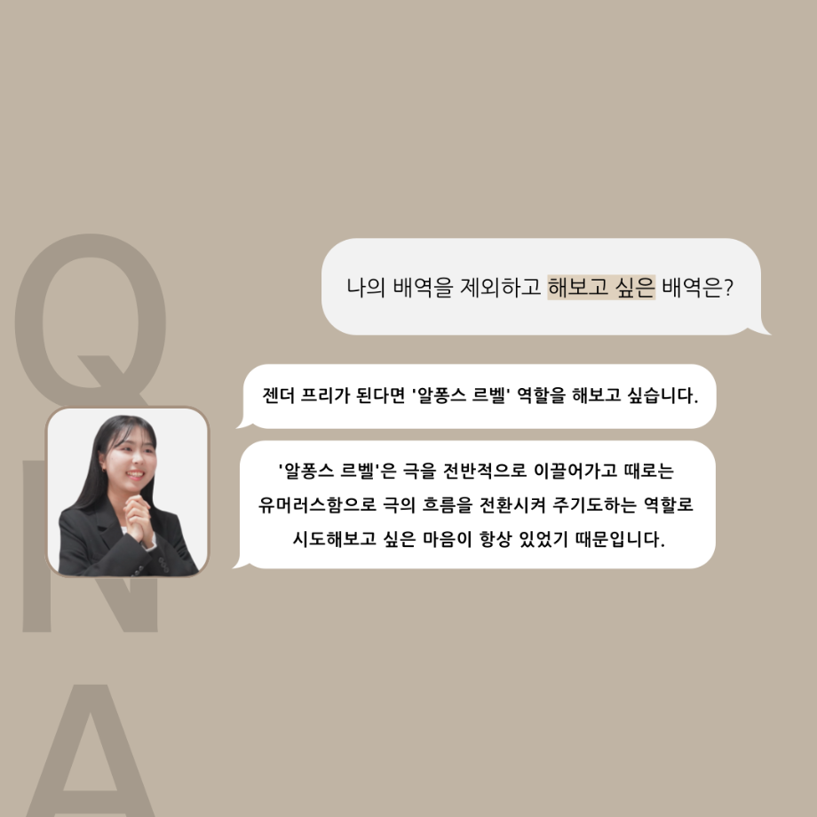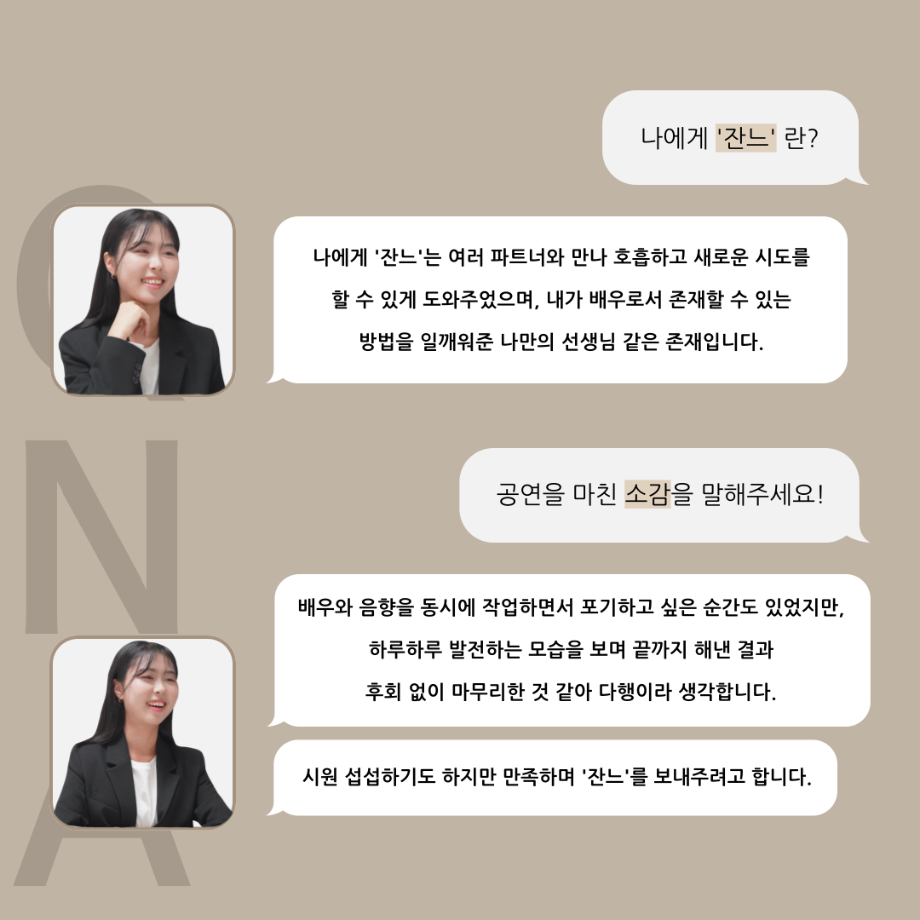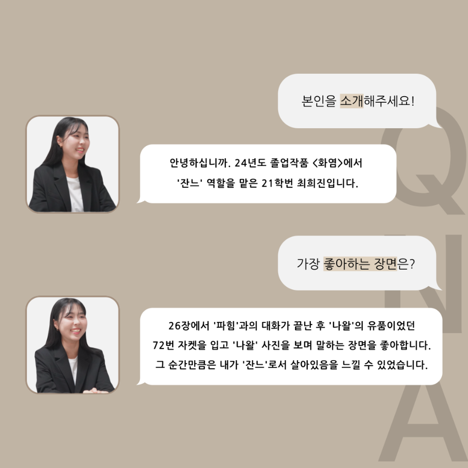 본문 시작 홈으로 커뮤니티 학과소개 입학정보 교수소개 학과과정 커뮤니티 공연예매 안내 홈페이지가이드 포토갤러리 공지사항 포토갤러리 작품DB 동아리 학사일정 학생회 포토갤러리 페이스북 트위터 프린트 ‘품’위있는 인‘터뷰’ - 24년도 졸업작품 잔느 役 <최희진> 연기예술학과 3406 2024-12-23 안녕하십니까. 24년도 학회 ‘품’ 입니다. 학회 ‘품’의 열 아홉 번째 인터뷰로 세명대학교 연기예술학과 제 17회 졸업작품 <화염>의 잔느 역인 최희진 학우와 인터뷰 하는 시간을 가졌습니다. 가장 좋아하는 장면, 자신의 배역을 제외하고 해보고 싶은 배역 그리고 준비하면서 어려웠던 부분과 공연을 마친 소감 등에 대해 인터뷰 하는 시간을 가졌습니다. 앞으로 있을 인터뷰 컨텐츠인 ‘품터뷰’ 많은 사랑 부탁드립니다. 목록 이전‘품’위있는 인‘터뷰’ - 24년도 졸업작품 르벨 役 <정성주> 다음 ‘품’위있는 인‘터뷰’ - 24년도 졸업작품 시몽 役 <이종화> 담당부서 : 연기예술학과 담당자 : - 연락처 : 043-649-1733 최종수정일 : 2024-10-26 만족도조사 만족도 조사 이 페이지에서 제공하는 정보에 대하여 만족하시나요? 매우만족 만족 보통 불만족 매우불만족