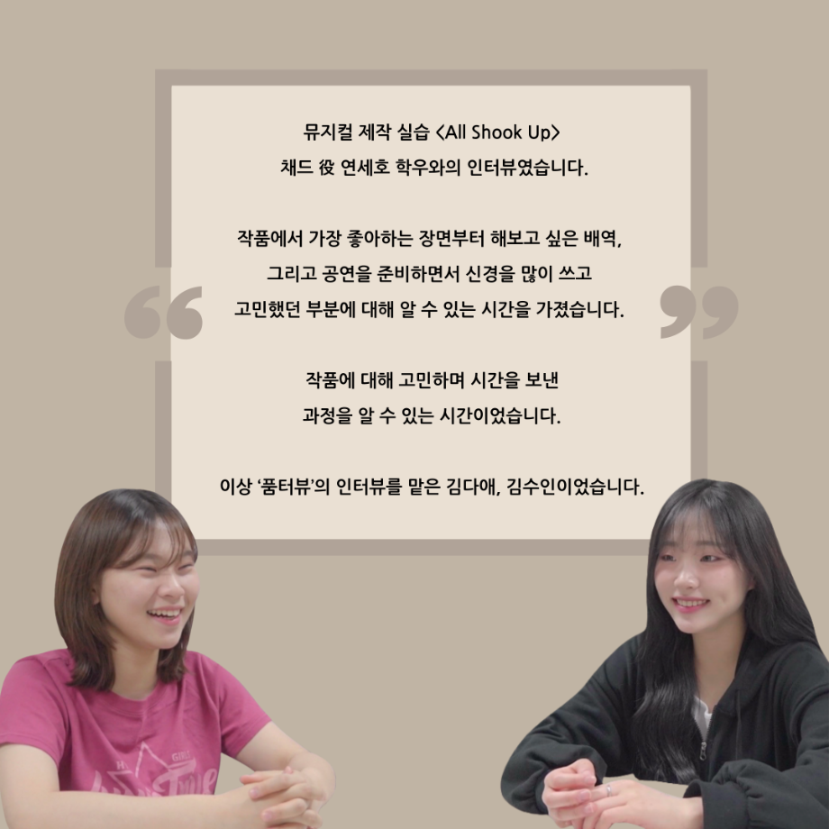 본문 시작 홈으로 커뮤니티 학과소개 입학정보 교수소개 학과과정 커뮤니티 공연예매 안내 홈페이지가이드 포토갤러리 공지사항 포토갤러리 작품DB 동아리 학사일정 학생회 포토갤러리 페이스북 트위터 프린트 ‘품’ 위 있는 인 ‘터뷰’ - 뮤지컬 제작실습 <올슉업> 채드 연세호 카드 뉴스 연기예술학과 2609 2025-01-10 . 목록 이전‘품’위있는 인‘터뷰’ - 24년도 뮤지컬제작실습 학생 연출 <임소정> 다음 ‘품’ 위 있는 인 ‘터뷰’ - 뮤지컬 제작실습 <올슉업> 나탈리 안수연 카드 뉴스 담당부서 : 연기예술학과 담당자 : - 연락처 : 043-649-1733 최종수정일 : 2024-10-26 만족도조사 만족도 조사 이 페이지에서 제공하는 정보에 대하여 만족하시나요? 매우만족 만족 보통 불만족 매우불만족