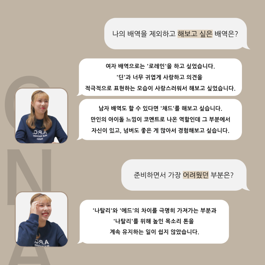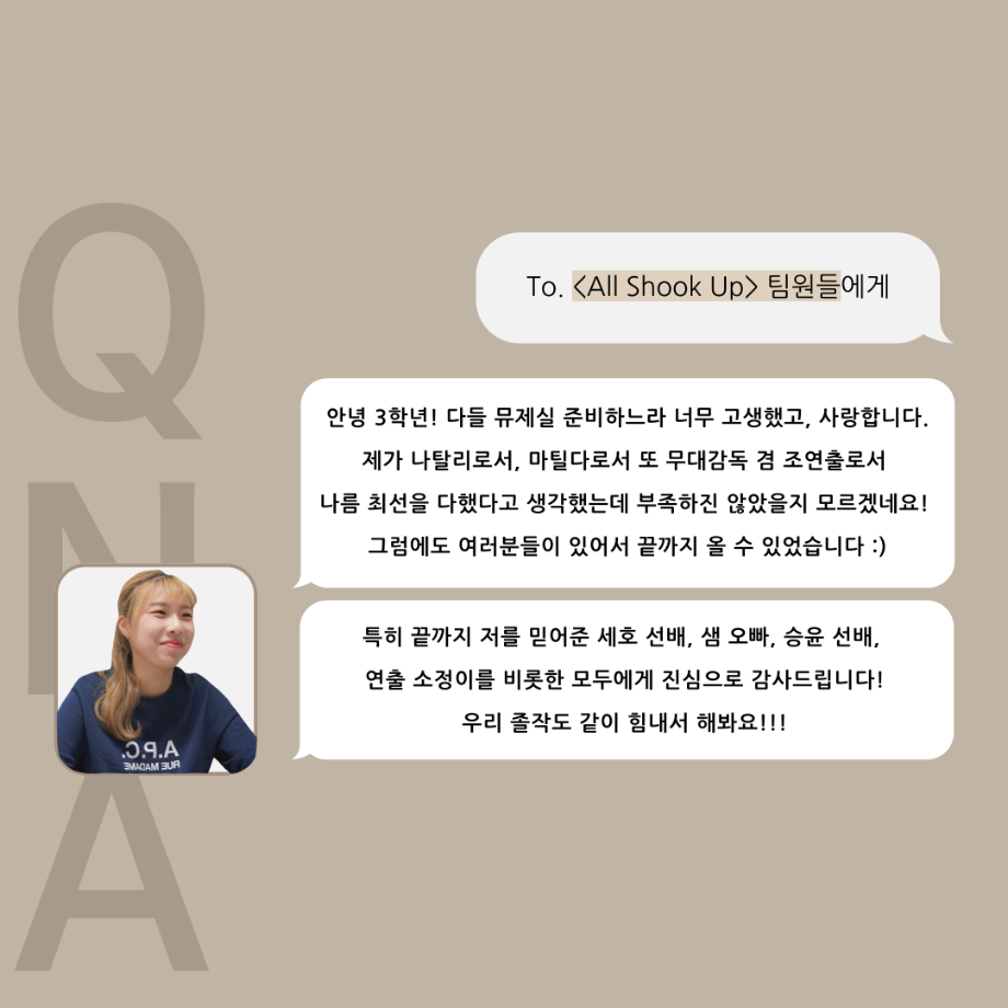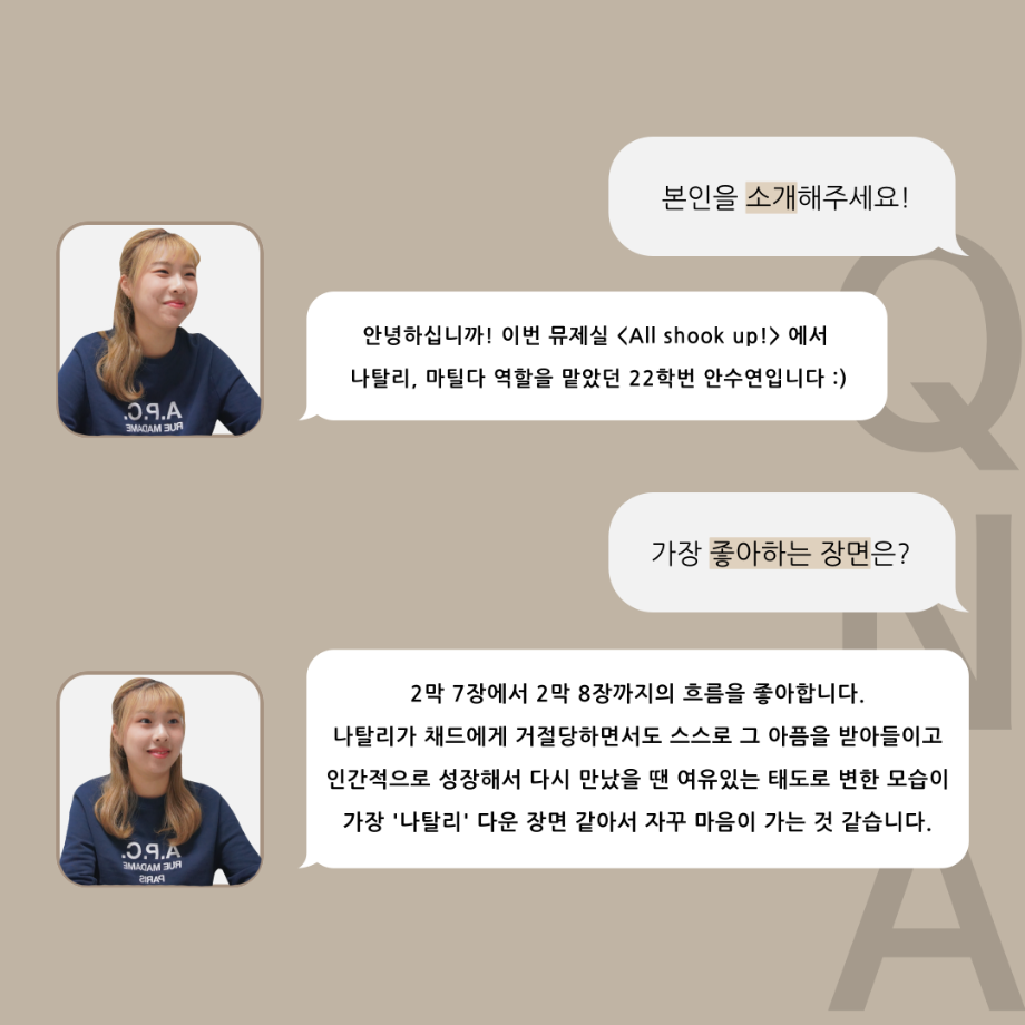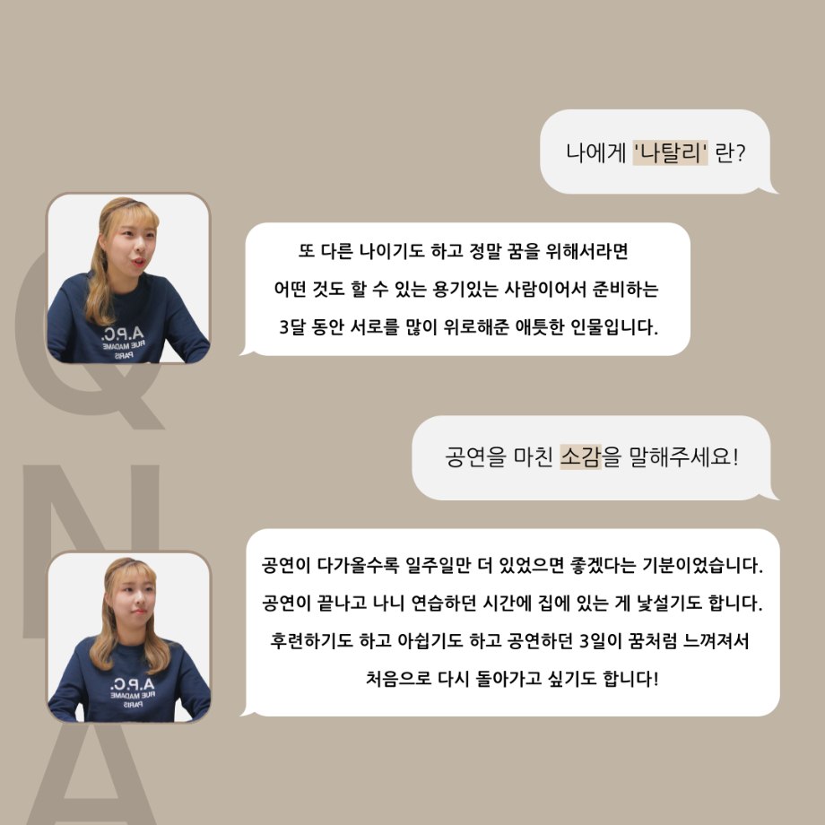 본문 시작 홈으로 커뮤니티 학과소개 입학정보 교수소개 학과과정 커뮤니티 공연예매 안내 홈페이지가이드 포토갤러리 공지사항 포토갤러리 작품DB 동아리 학사일정 학생회 포토갤러리 페이스북 트위터 프린트 ‘품’ 위 있는 인 ‘터뷰’ - 뮤지컬 제작실습 <올슉업> 나탈리 안수연 카드 뉴스 연기예술학과 2851 2025-01-14 . 목록 이전‘품’ 위 있는 인 ‘터뷰’ - 뮤지컬 제작실습 <올슉업> 채드 연세호 카드 뉴스 다음 ‘품’ 위 있는 인 ‘터뷰’ - 뮤지컬 제작실습 <올슉업> 데니스정지운 카드 뉴스 담당부서 : 연기예술학과 담당자 : - 연락처 : 043-649-1733 최종수정일 : 2024-10-26 만족도조사 만족도 조사 이 페이지에서 제공하는 정보에 대하여 만족하시나요? 매우만족 만족 보통 불만족 매우불만족