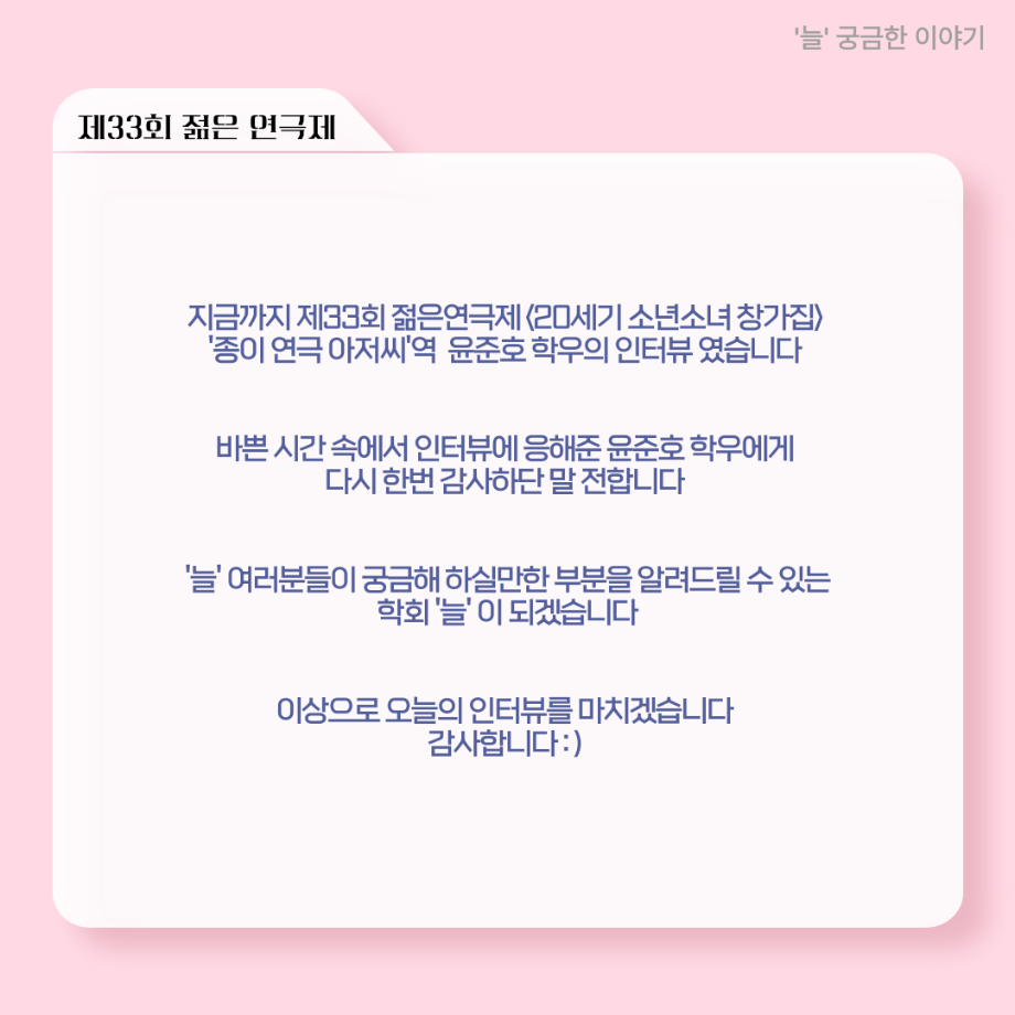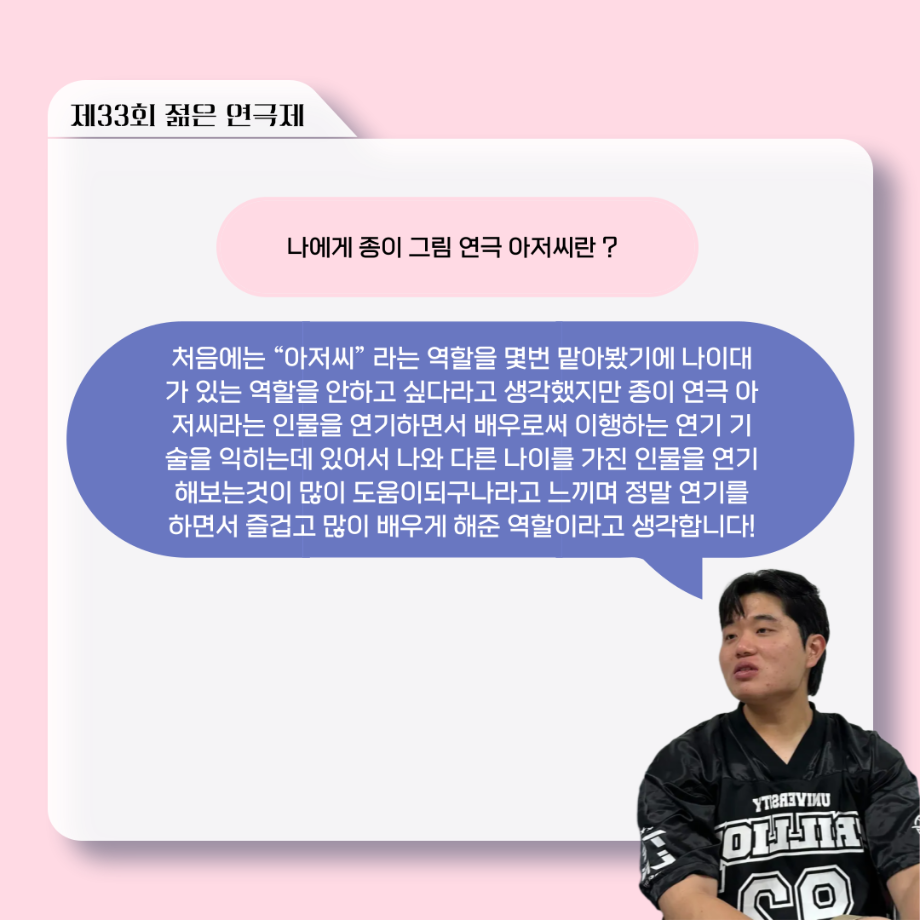 본문 시작 홈으로 커뮤니티 학과소개 입학정보 교수소개 학과과정 커뮤니티 공연예매 안내 홈페이지가이드 포토갤러리 공지사항 포토갤러리 작품DB 동아리 학사일정 학생회 포토갤러리 페이스북 트위터 프린트 ‘늘‘ 궁금한 이야기 - 젊은연극제 ‘20세기 소년소녀 창가집’ 종이연극 아저씨 役 < 윤준호 > 연기예술학과 1458 2025-08-28 . 목록 이전‘늘‘ 궁금한 이야기 - 젊은연극제 ‘20세기 소년소녀 창가집’ 사이토 役 < 박신현 > 다음 ‘늘‘ 궁금한 이야기 - 젊은연극제 ‘20세기 소년소녀 창가집’ 다큐pd 役 < 임재완 > 담당부서 : 연기예술학과 담당자 : - 연락처 : 043-649-1733 최종수정일 : 2024-10-26 만족도조사 만족도 조사 이 페이지에서 제공하는 정보에 대하여 만족하시나요? 매우만족 만족 보통 불만족 매우불만족